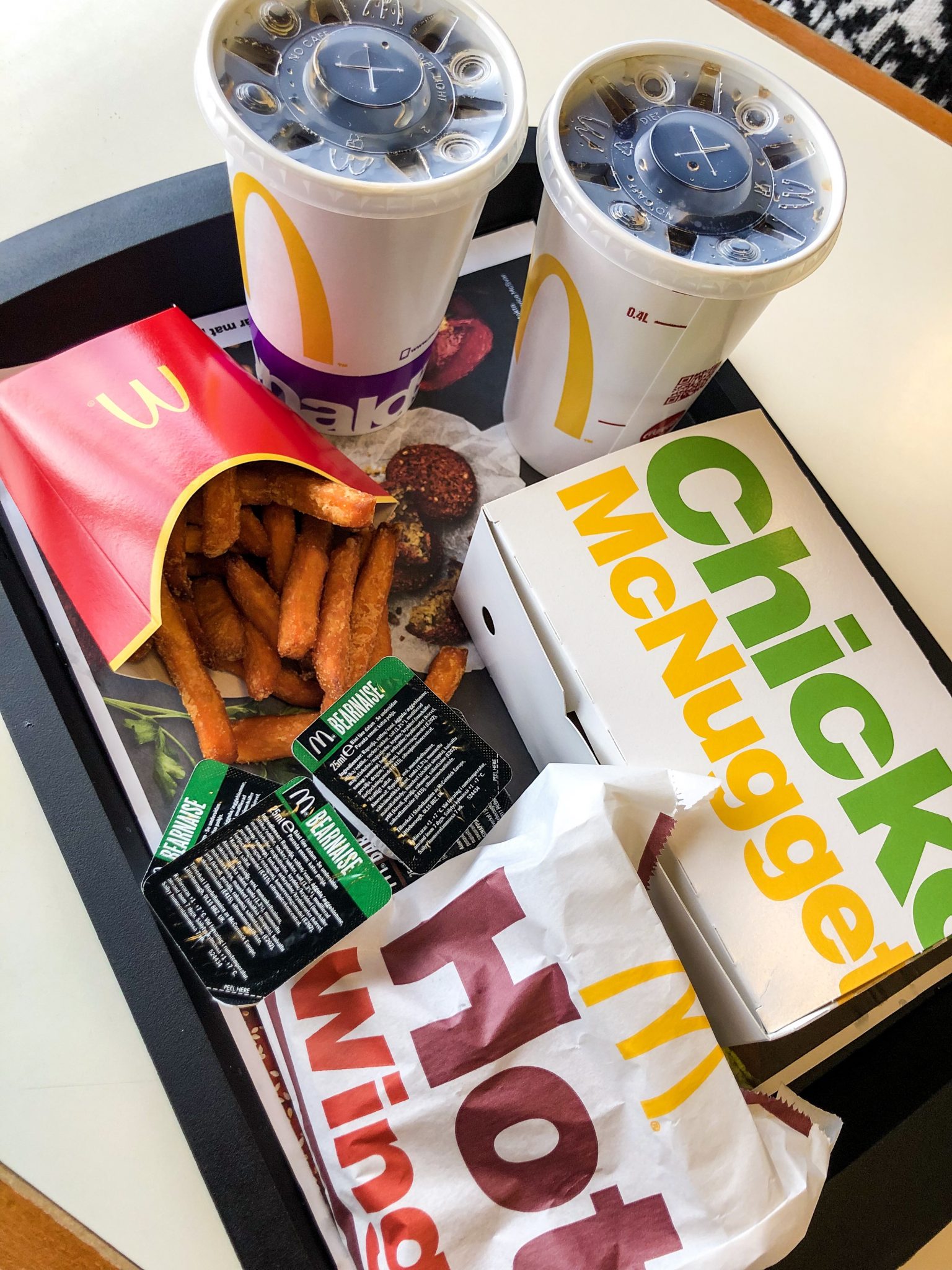 Smarrigt med snabbmat ibland. De runda grunkorna är de inte från pappret som brukar ligga på brickan? Ser inte heller vad de ska föreställa. Ha en fin kväll. Kram Sara