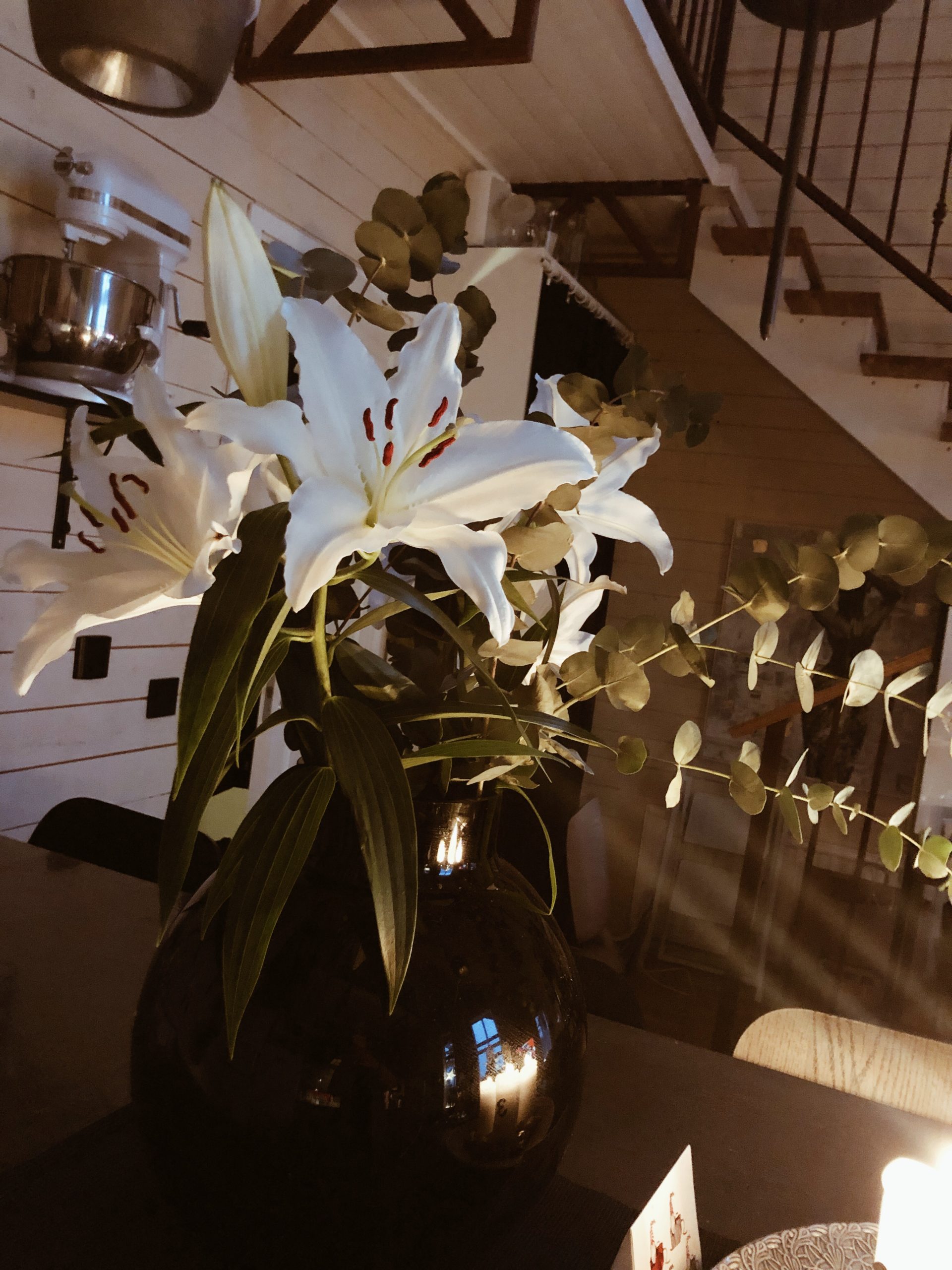 Alltså! Liljor och eucalyptus får mina ”må bra” hormoner att studsa. Doften av eucalyptus…. men jaaa, så god doft! Ska bara klippa bort de där äckliga röda prylarna som istället stinker.