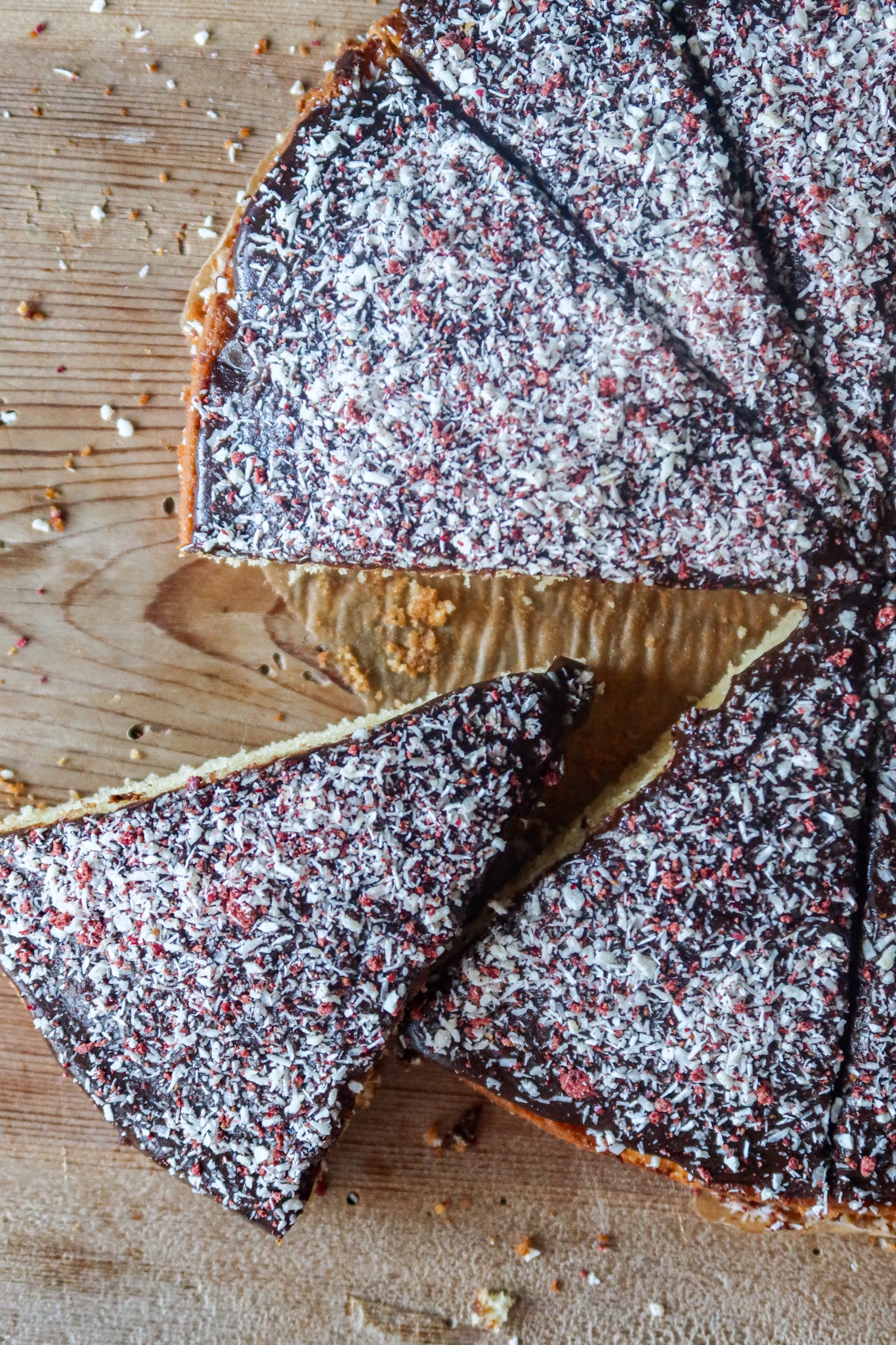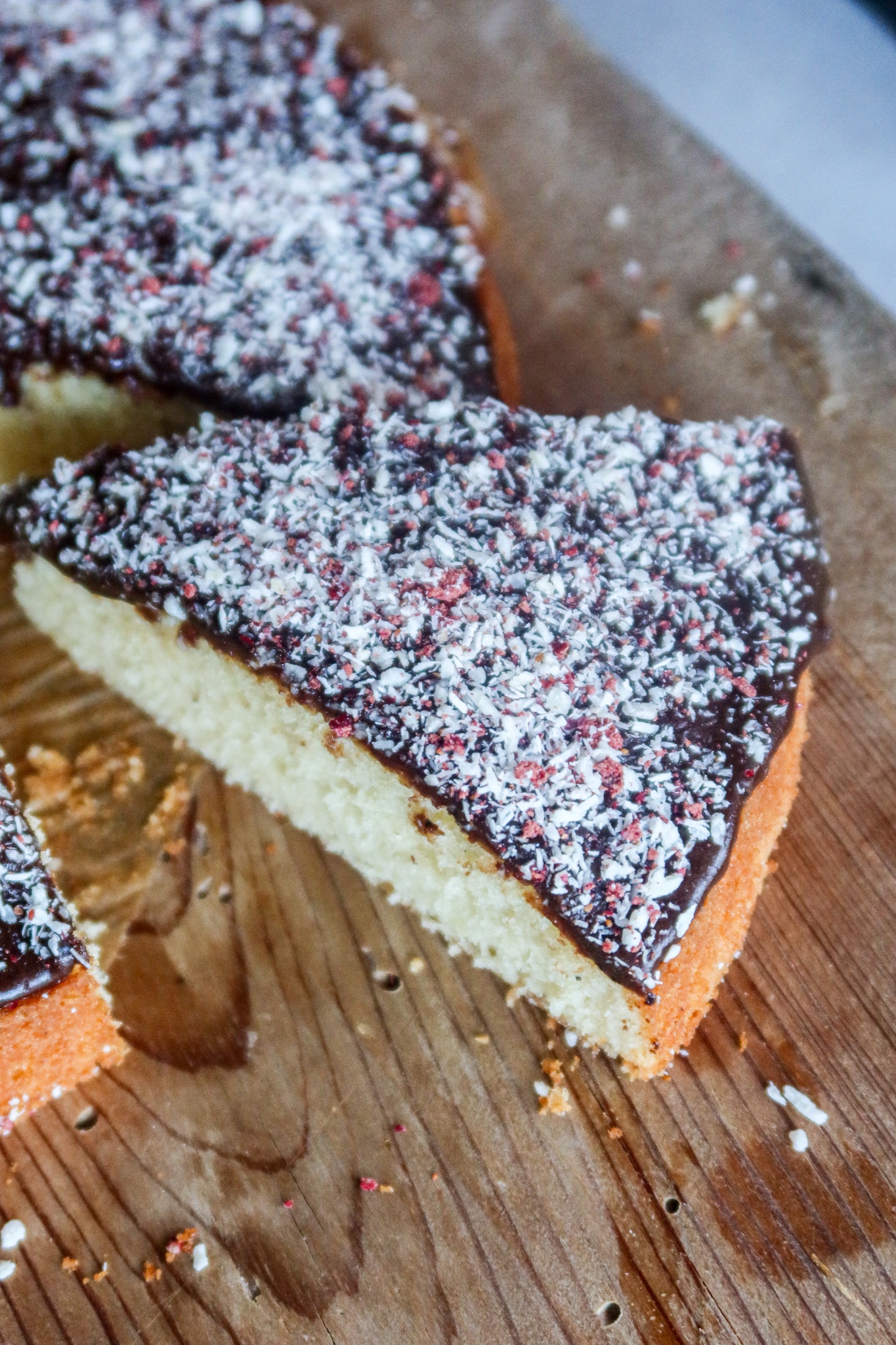 6) Ta fram en grillspettssticka eller liknande och stick massor med hål i kakan. Bred över glasyren. Blanda kokos och lingonpulver. Strö över det på kakan.