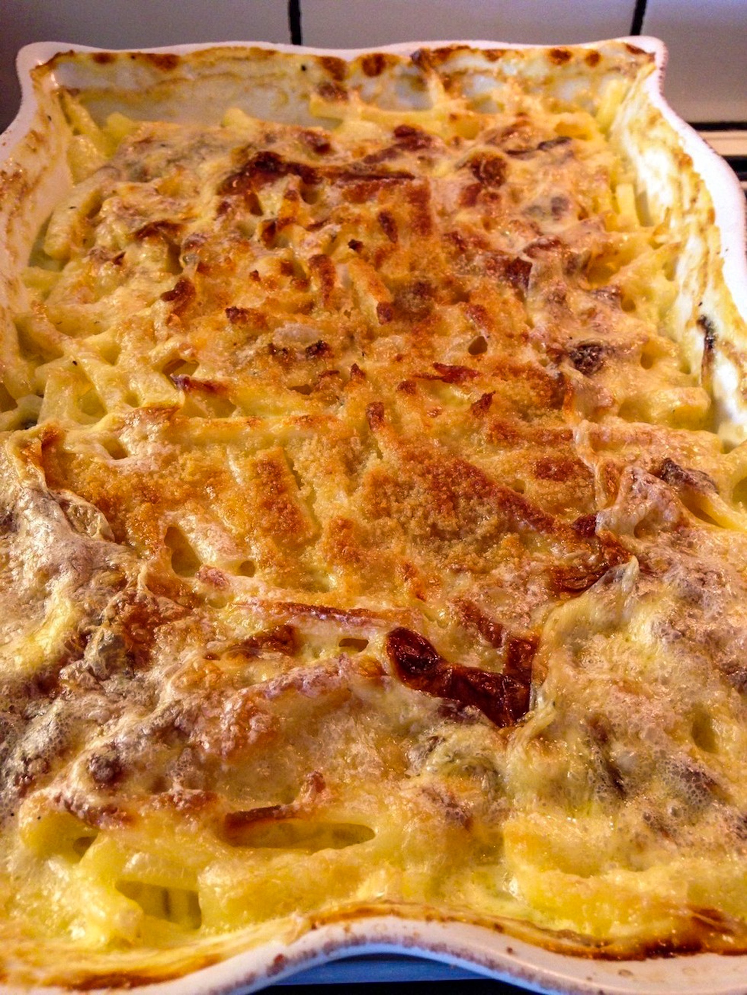 3. Ta fram en ugnsform, varva sedan potatis med skink/lök strimlorna. Kom ihåg att salta och peppra emellan varje lager, tänk dock på att skinkan är lite salt också.