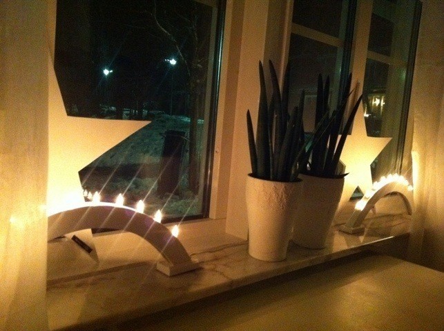 Vårt köksfönster…. Dessa adventsljusstakar lyser nätterna igenom. Det är så himla mysigt att komma ner
