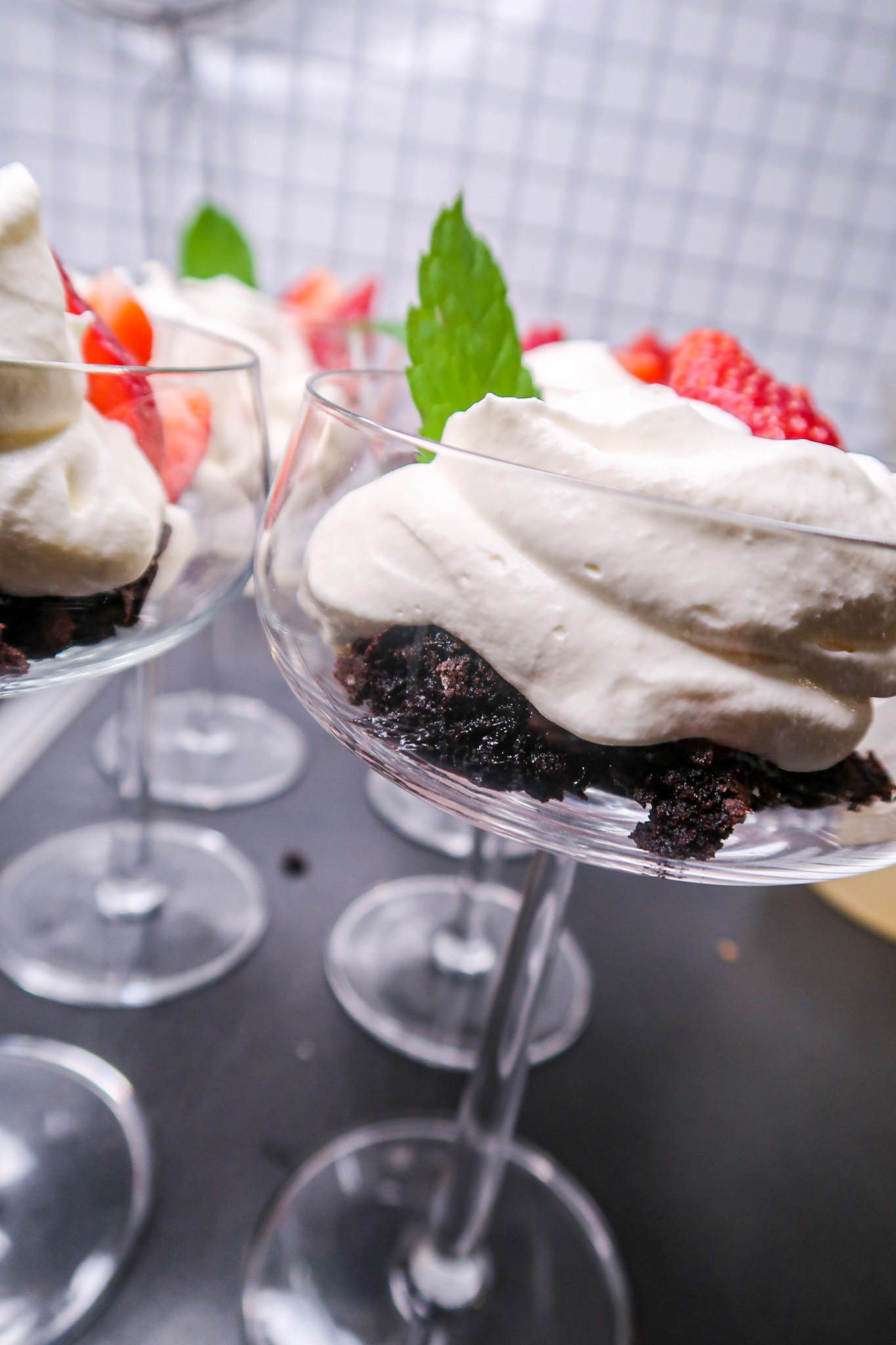 6) Låt kladdkakan gärna svalna helt. Ta sedan och skeda ur kakan och lägg i glasen. Toppa med vispad grädde, jordgubbar och myntablad.