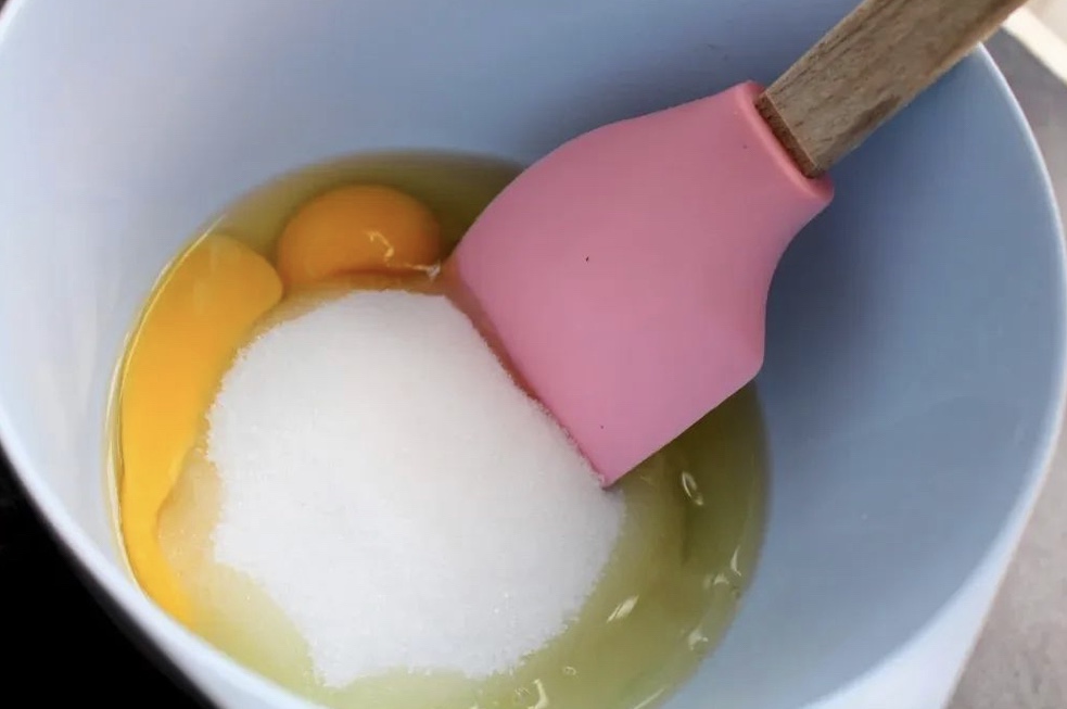 3) Rör ihop ägg och socker med en slickepott. Vispa inte för vi vill inte ha luft i kakan, den ska bara vara kladdig.
