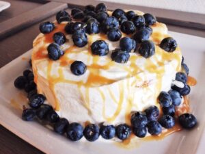 5) Vispa 5 dl grädde. Varva sedan botten med kolakräm och grädde. Lägg på ett nytt lager med botten osv. Toppa med grädde, kolakräm och blåbär.
