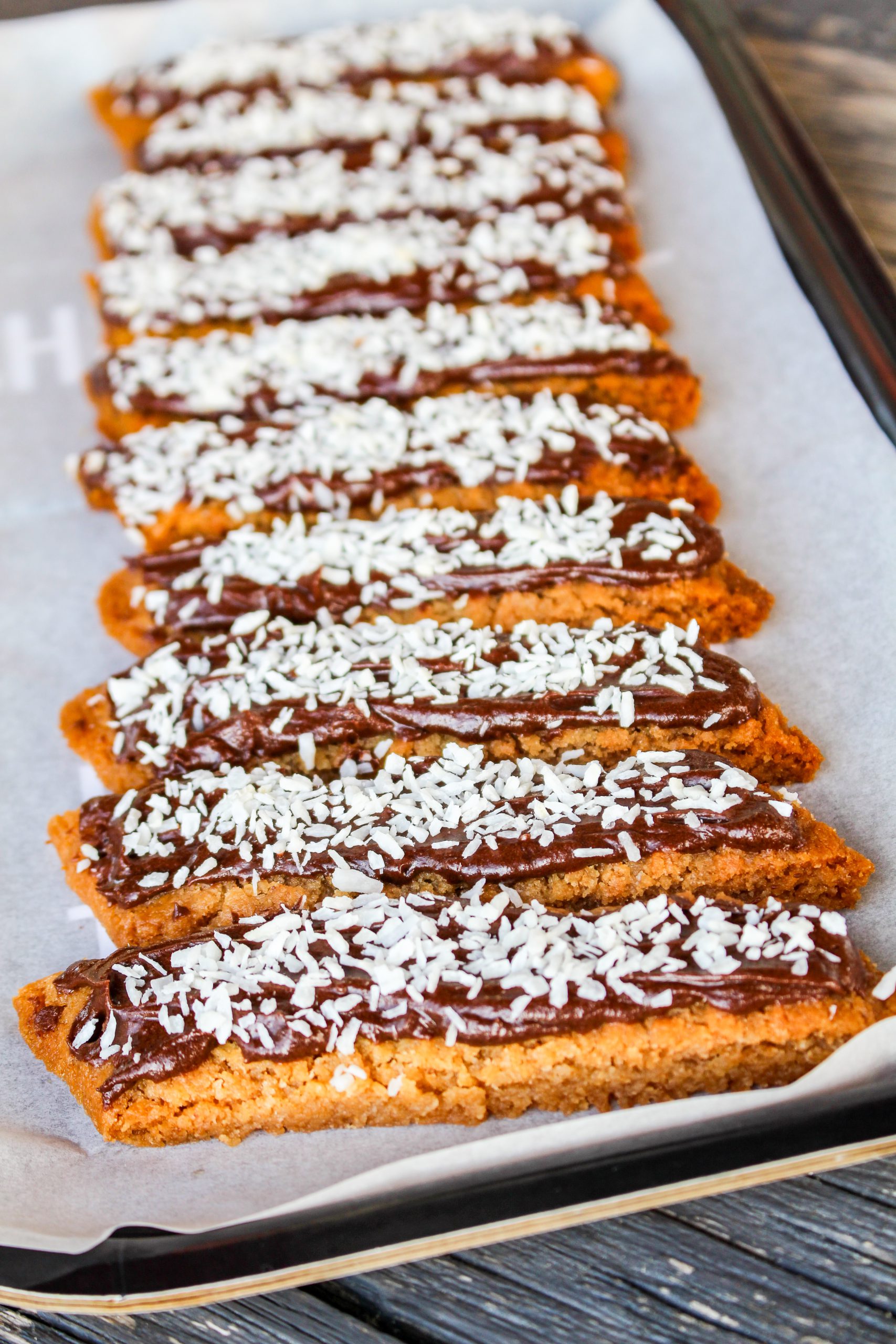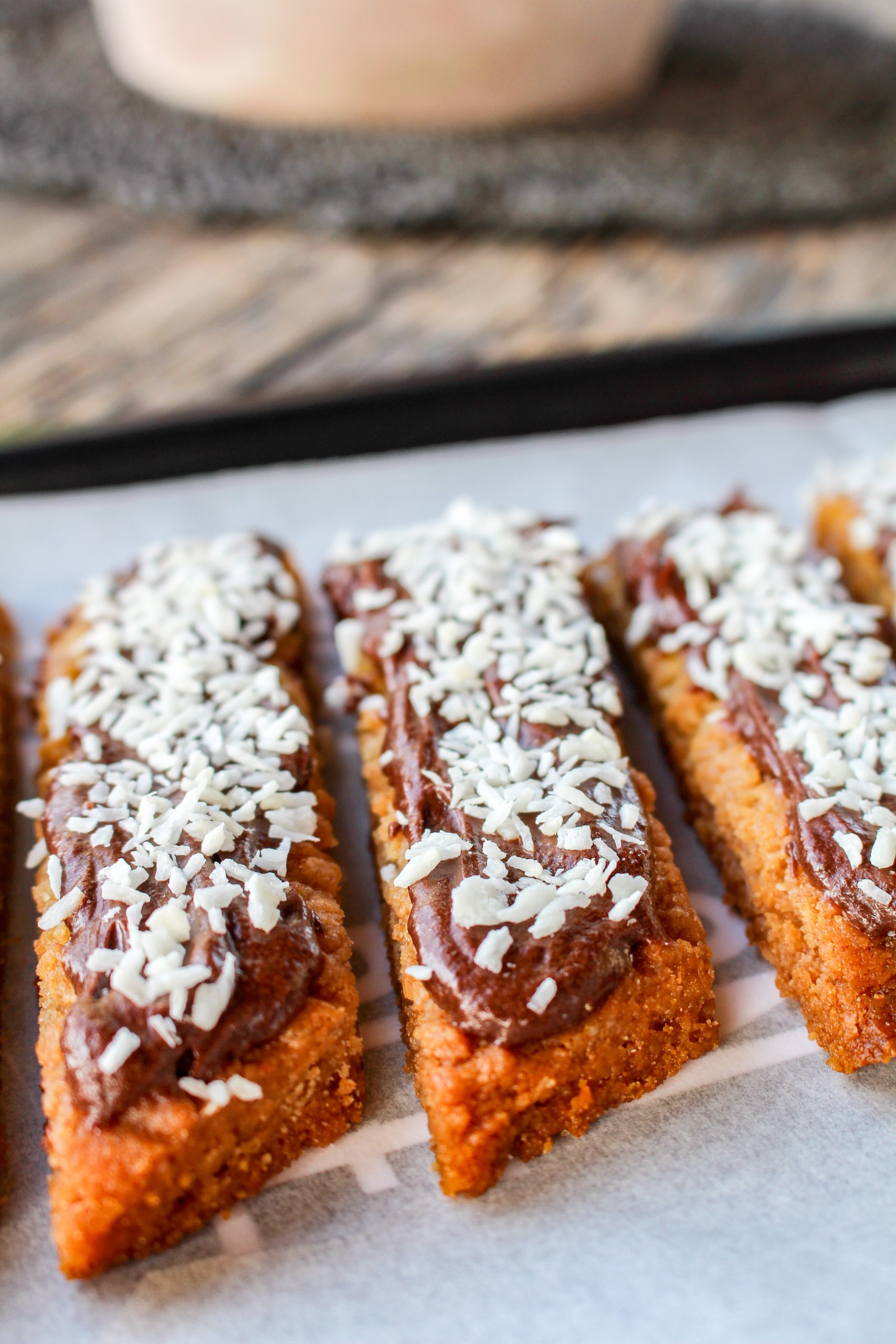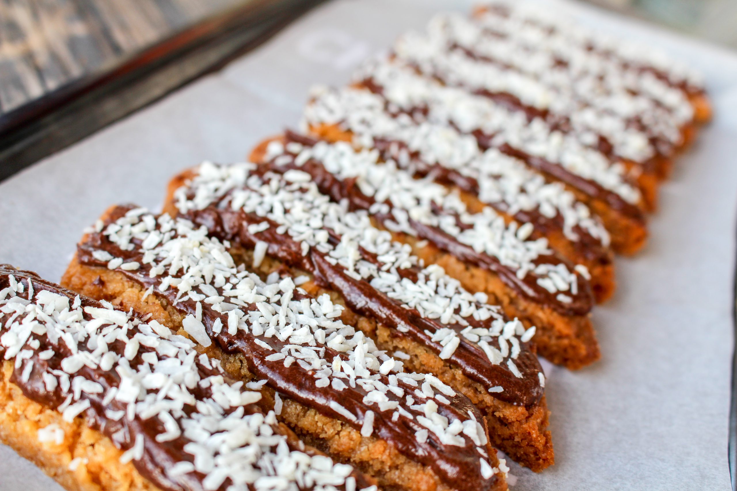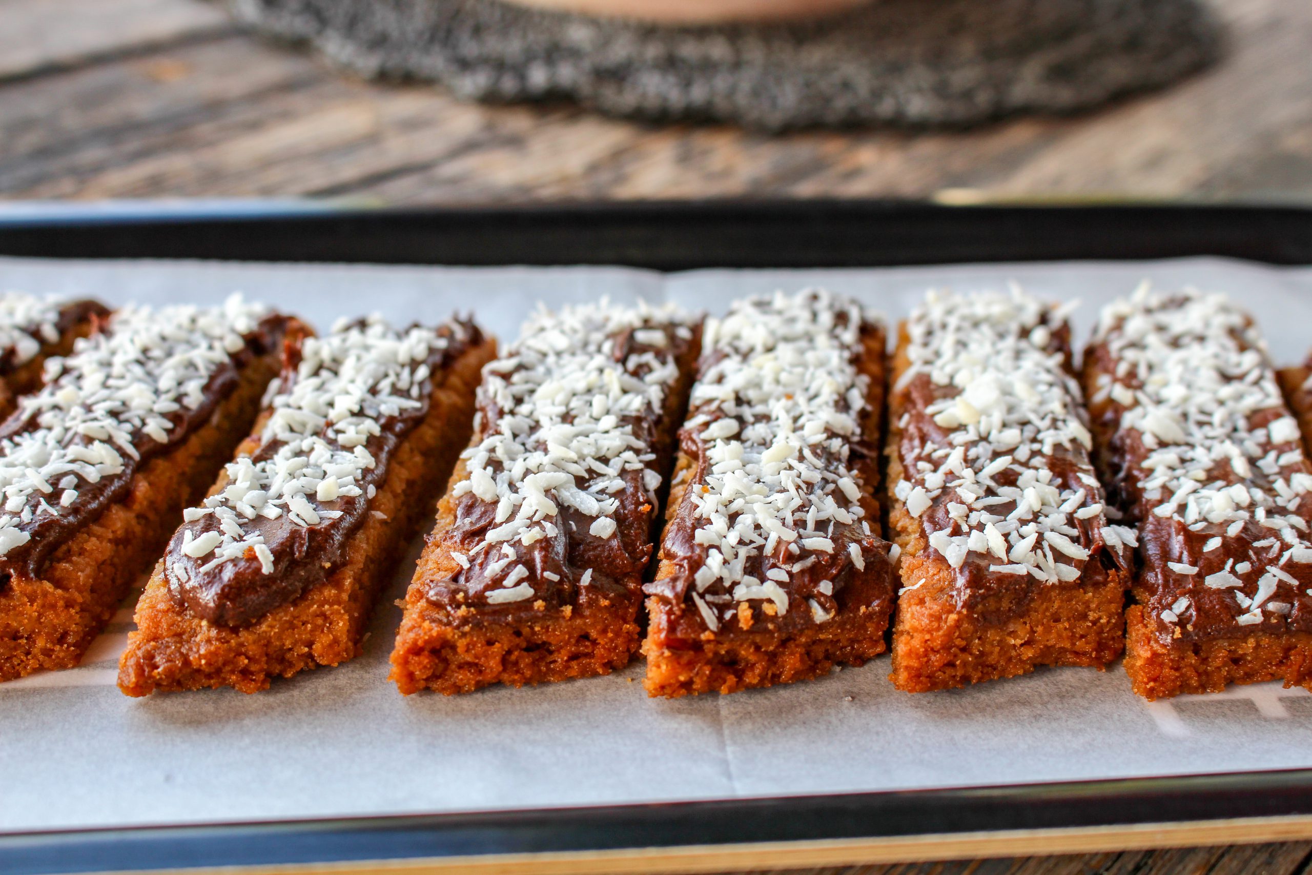 6) Ta ut kakorna och dela dem i snittar. Låt sedan svalna helt. Bred sedan ut glasyren på varje kaka. Toppa med kokosflingor.