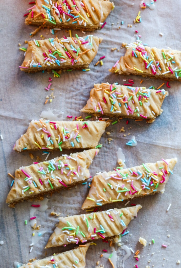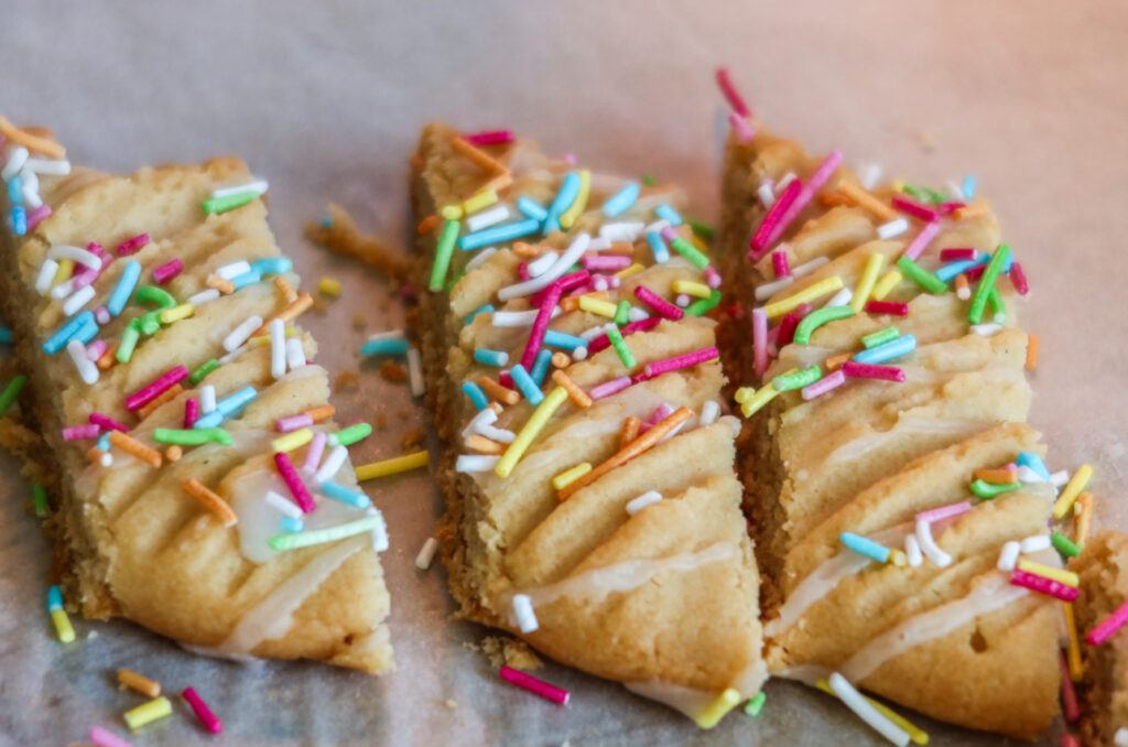 Se till att vara lite snabb med strösslet efter att du ringlat på glasyren, då fastnar strösslet på glasyren innan det torkar vilket gör att strösslet sitter mycket bättre.