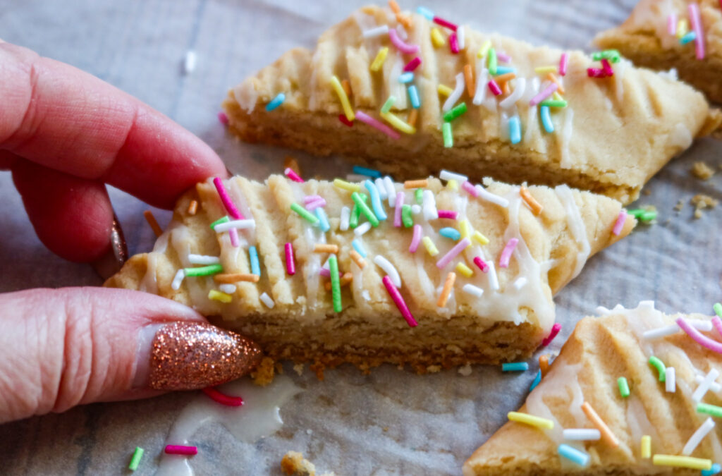 5. Grädda i ca 15 min. Ta ut, ta sedan fram en kniv eller degskrapa och dela längden i ca 13-15 bitar. Dela gärna lite snett så kakorna blir lite sneda. Låt sedan svalna.