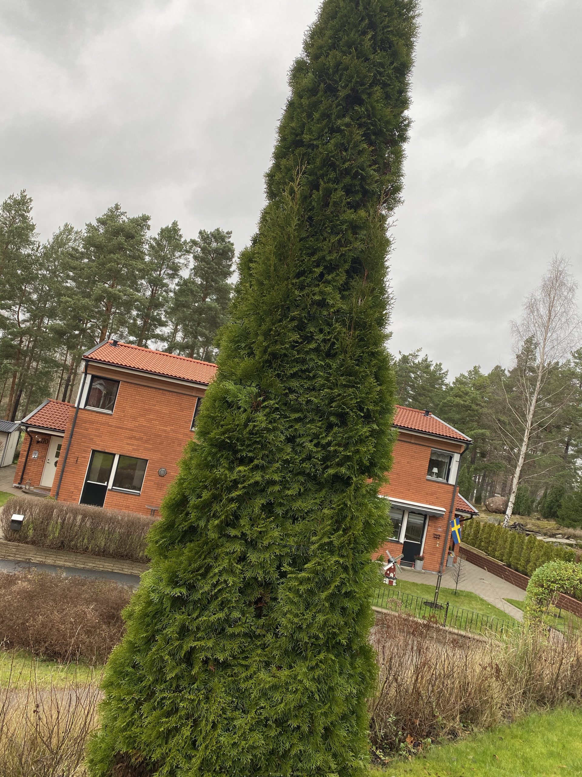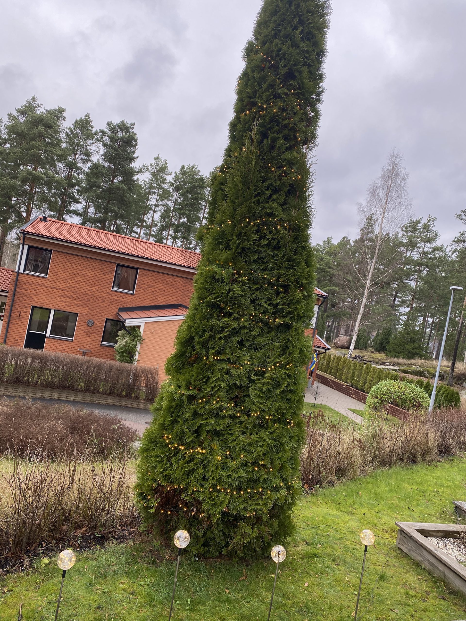 Idag tog vi då äntligen tag i besiktningen ute i trädgården. Det är mörkt som helskotta när man kommer hem på kvällen även om utelamporna tänds automatiskt när vi kommer hem. Har länge sneglat på den där enen och tänkt att den kommer bli en fin julgran!