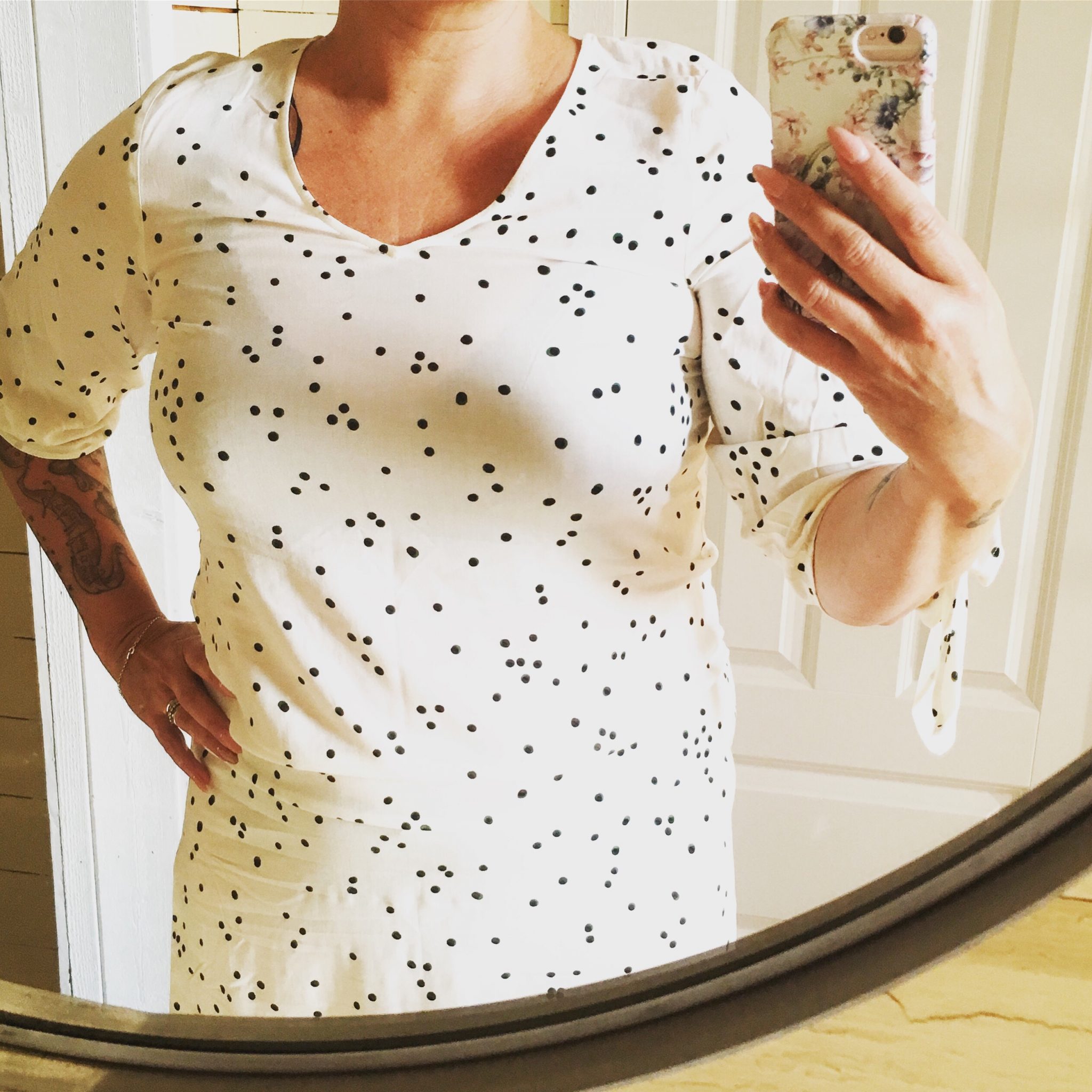 Åh, såg sina stories på insta om klänningen. Jag fattar nada med H&M:s storlekar nuförtiden!! Jag är en 38/40. Blusar är ett skämt (även sådana klänningar likt modellen du har på dig). Får nästan alltid köpa 42 då.
