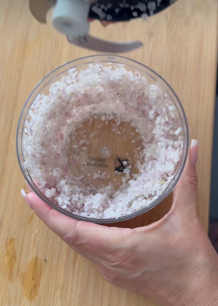 2. Riv löken fint, själv använde jag lökhackaren ovan, och så körde jag extra många gånger. Blir perfekt! Knäck sedan i äggen, ha i löken, köttfärsen, smula i buljongtärningen, farinsocker, fransk senap, kalvfond, peppar & salt. Arbeta sedan färsen smidig, det ska bli en smet.