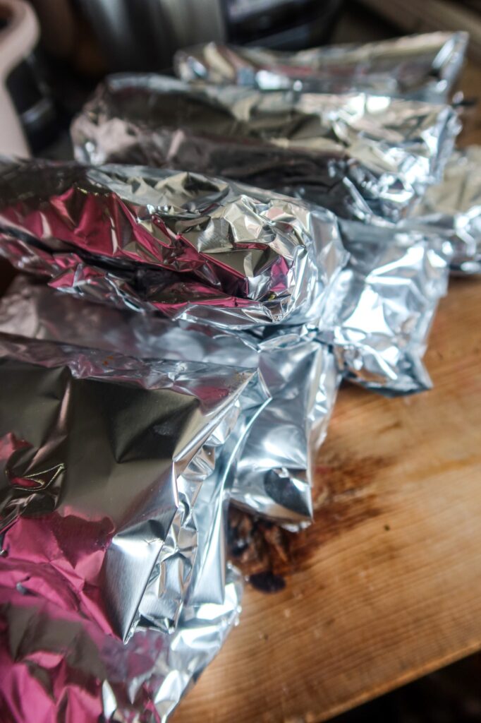 3. Fyll tortillabröden med köttfärsröran och toppa med riven ost, rulla ihop och rulla sedan in i folie.