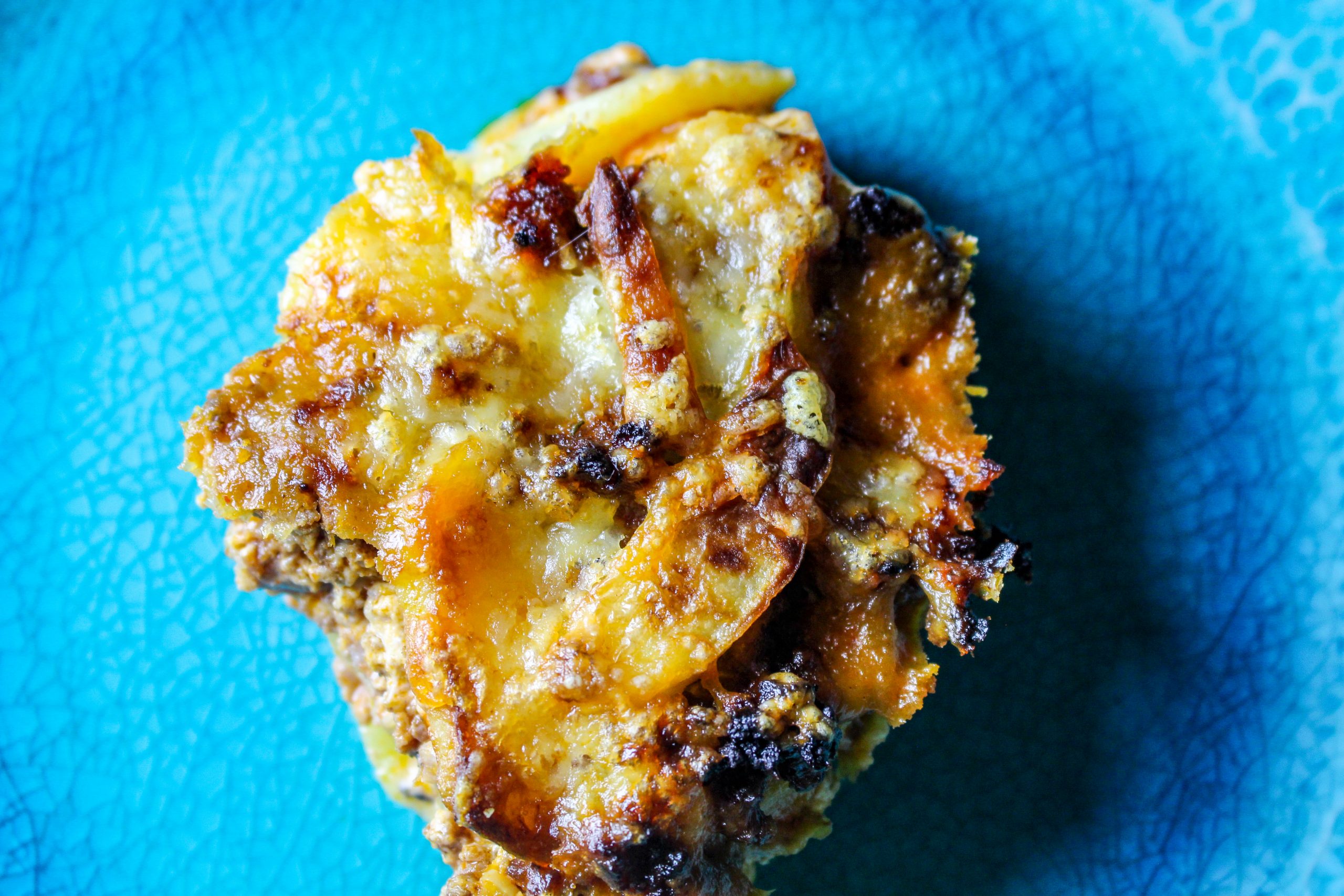 4) Fördela ut potatisskivor i botten, sedan ett lager med köttfärsröra uppepå. Sedan ett lager till med potatis osv. Högst upp skivar du potatisarna i mindre stänger och fördelar ut. Häll över grädden.
