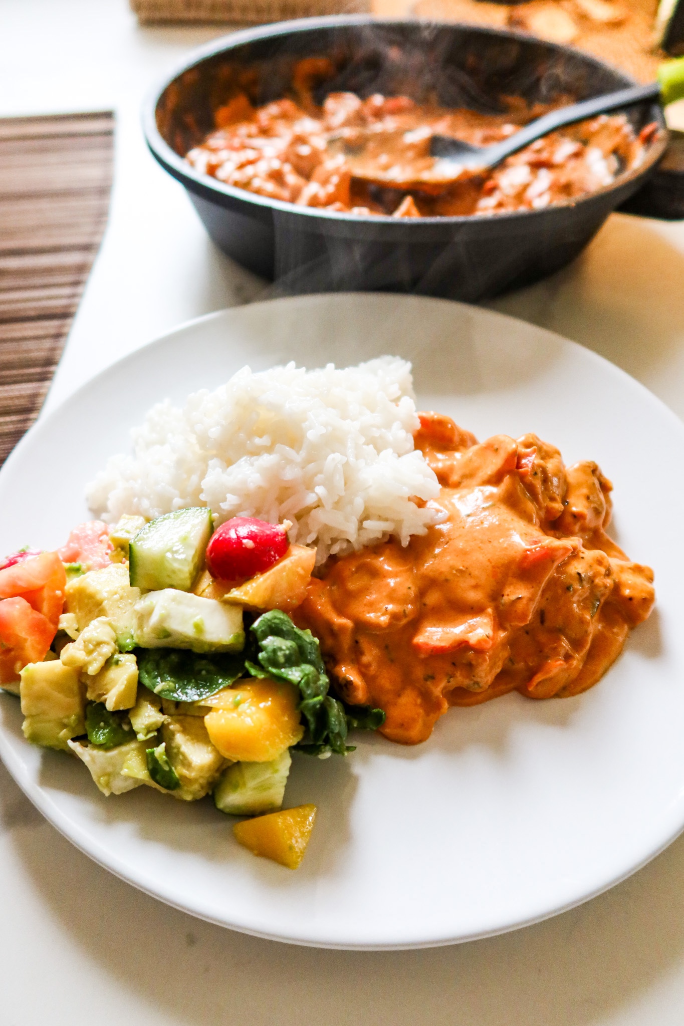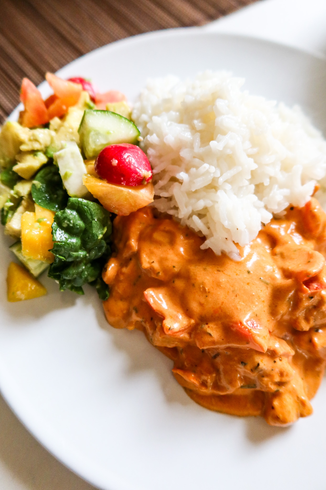 Tisdag redan, jag hade tänkt köra igång veckomatsedlarna denna veckan men det får bli nästa. Istället ska jag bjuda på ett riktigt smarrigt recept här på en kycklinggryta jag gjorde igår. Jag älskar ju kyckling och grytor blir såååå gott, man kan dessutom göra mycket. Jag serverade detta med ris och en riktigt god sallad. Här i Spanien har man in allt som går typ för frukt och grönt smakar så gott här. I denna sallad har jag spenatblad, spansk gurka, bitar av bifftomat, avokado, mango och rädisor.