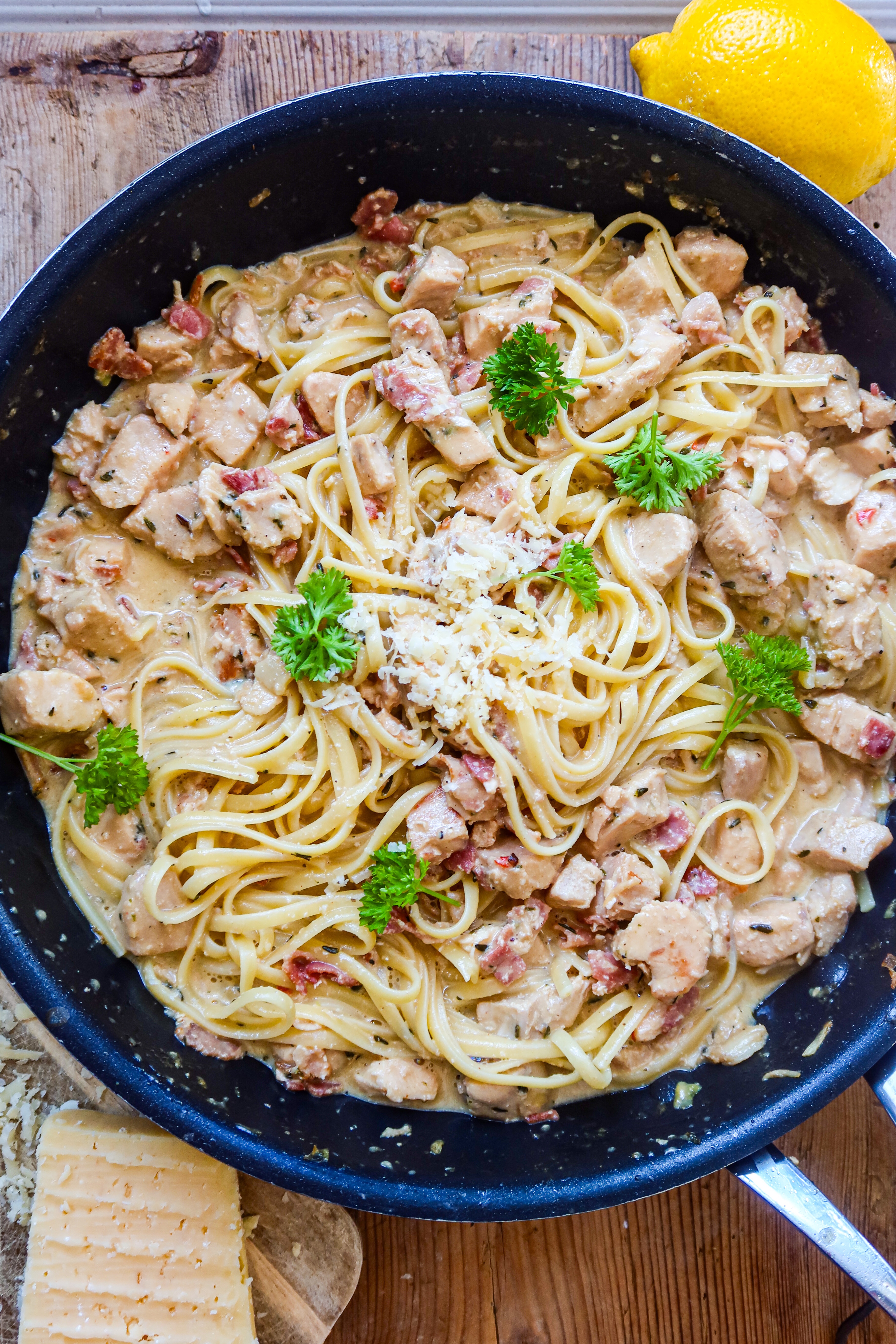 Jag gjorde en aaaalldeles fantastiskt god kycklingpasta här hemma häromdagen. Familjen slukade hela i ett nafs, hade en önskan om lite matlådor kanske men tji fick jag. ☺️ Det var ett mätt gäng som satt och ojade sig i soffan här hemma. ”Man åt kanske för mycket….”. Haha, då vet man att det var gott ju. I den här kycklingpastan hade jag i allt som kan tänkas vara gott. Bacon, vitt vin, timjan, vitlök, kycklingfond, västerbottensost och grädde. Det kan bara inte misslyckas.