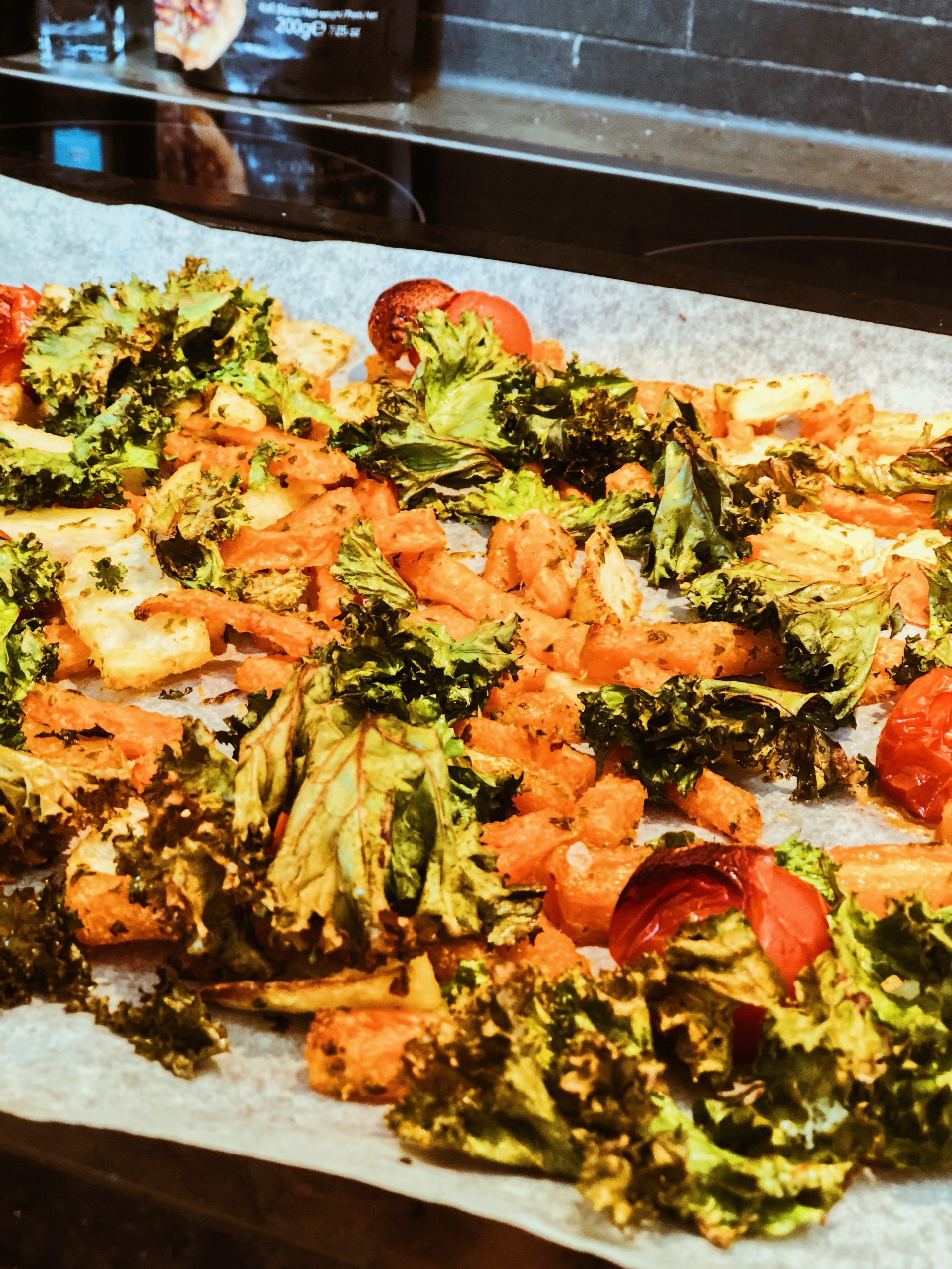 När killarna kom hem så lagade vi lite lunch. Min craving nu är denna maträtt. Rotfrukter, grönkål och tomater. Så sjukt gott.