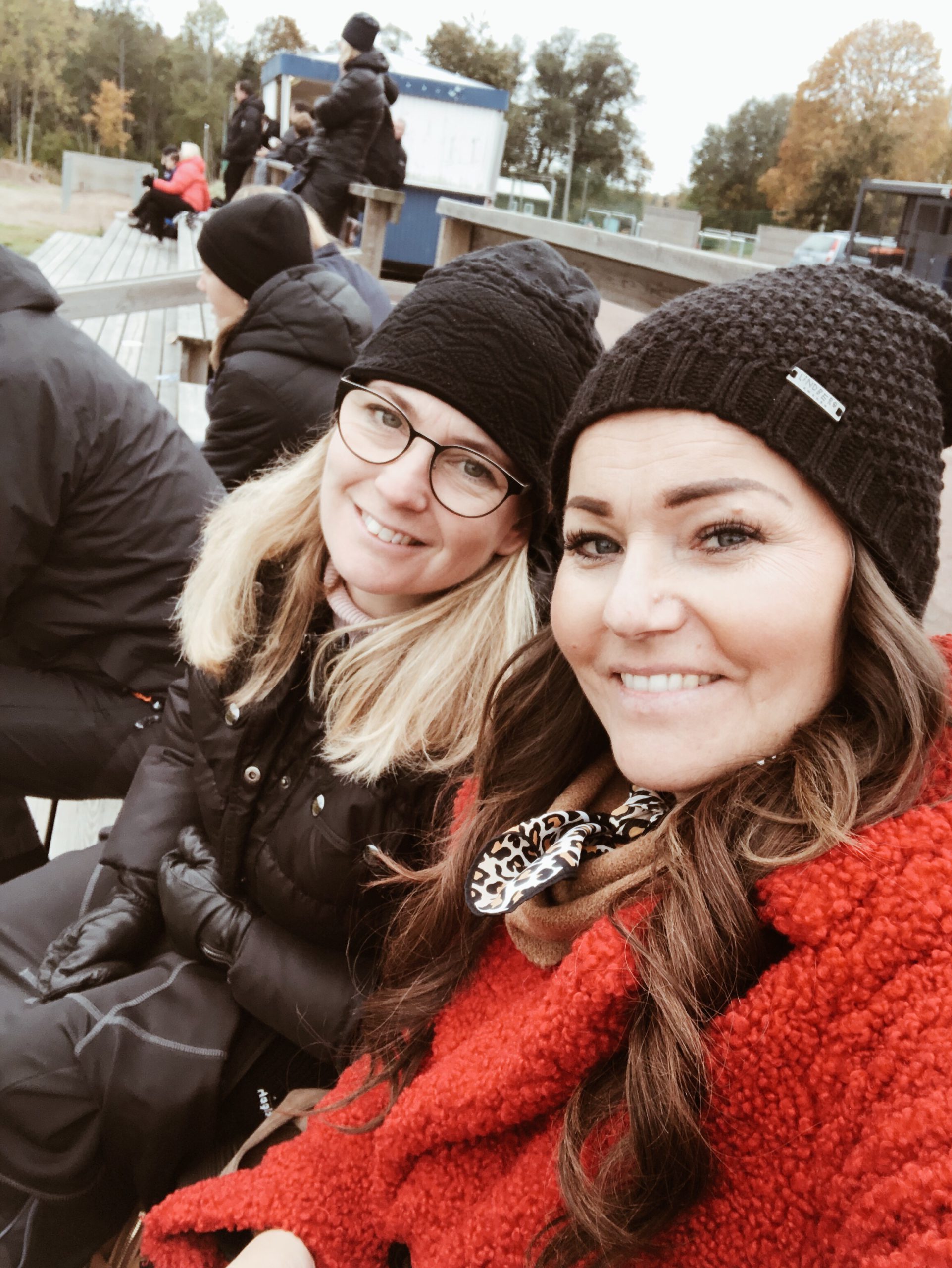 Tappra morsor (Annika och jag) uppe på läktaren, klädda som om det var 20 minus. Men gissa om det blir kylslaget med lite blåst? Fifan, jag frös ända in i benranglet.