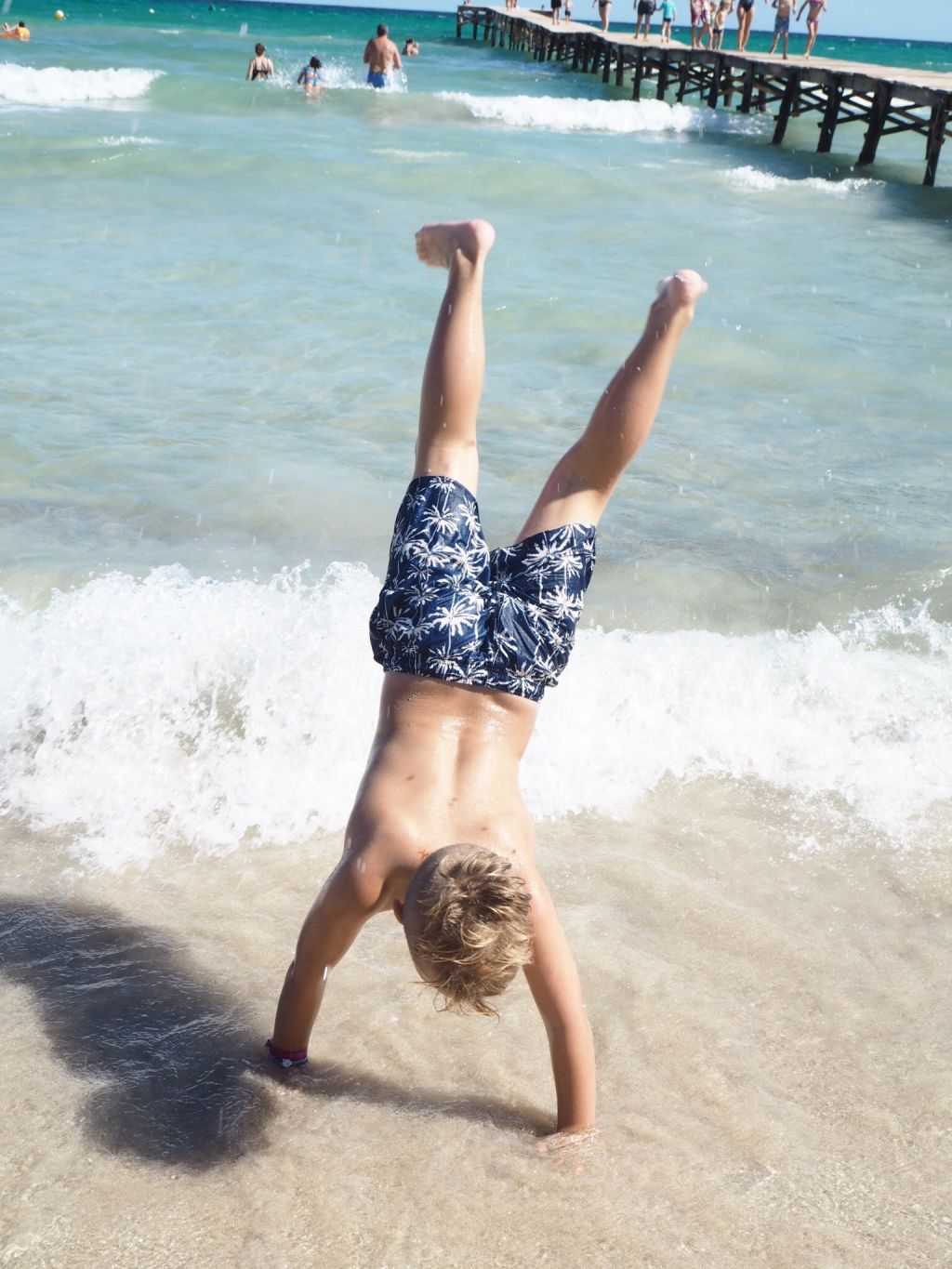 Den här fisen kommer nog att somna inom kort. Han har varit högt och lågt idag. Som här – när han övade på att stå på händer. Han ser redan ut att ha blivit brun som en pepparkaka. Han har ärvt sin fars hud (med spanska rötter) tack och lov. Värre hade det varit om det var mammans – alltså grönblek liksom. Jag är så sjukt blek alltså. Med tanke på att jag aldrig solar så lär jag knappt bli brun heller känns det som. Jag smörjer mig med 50 och håller mig nästan mest under parasollet. Ska försöka visa mig lite för solen i alla fall….lite färg skulle man ju vilja ha.