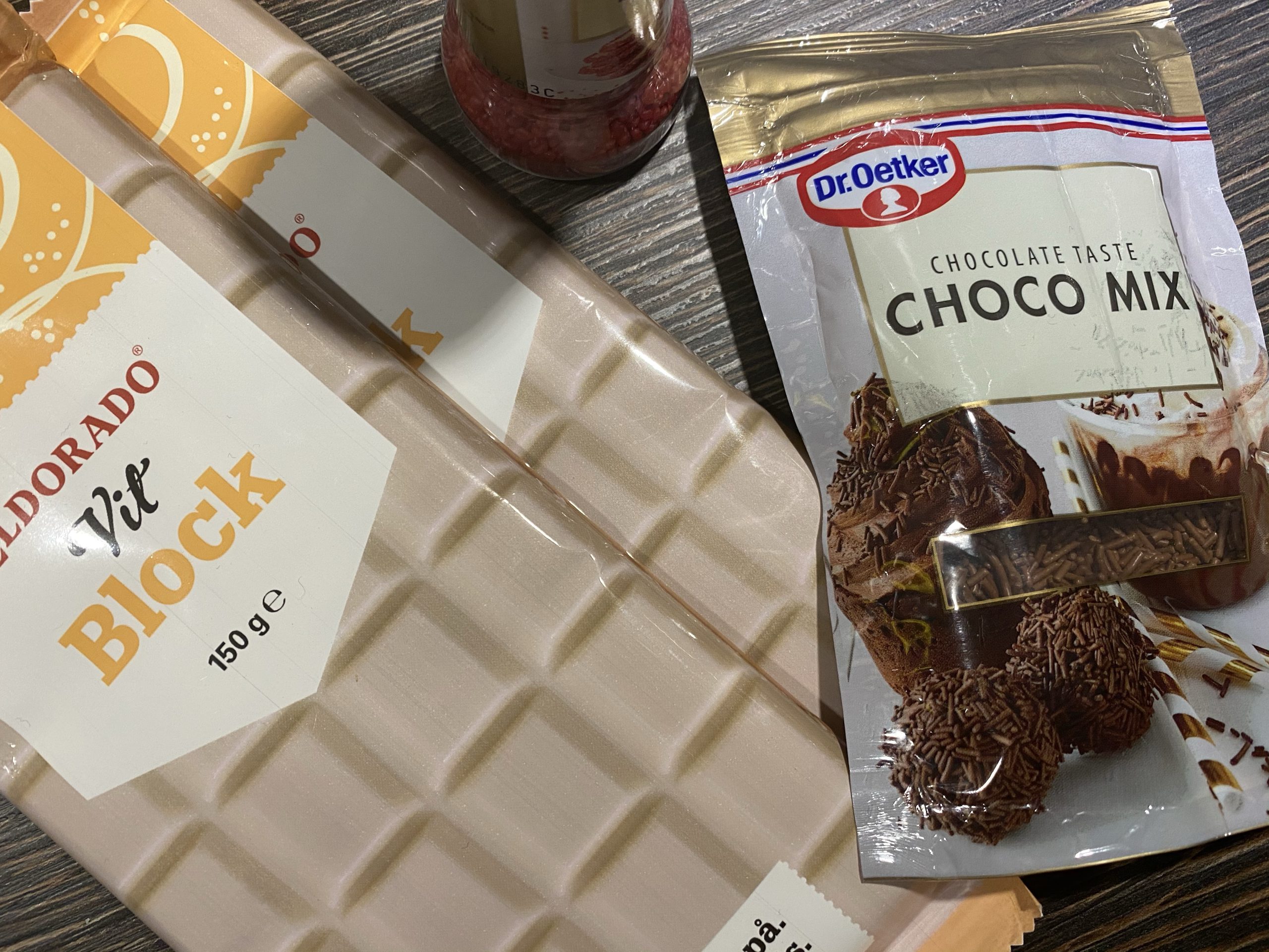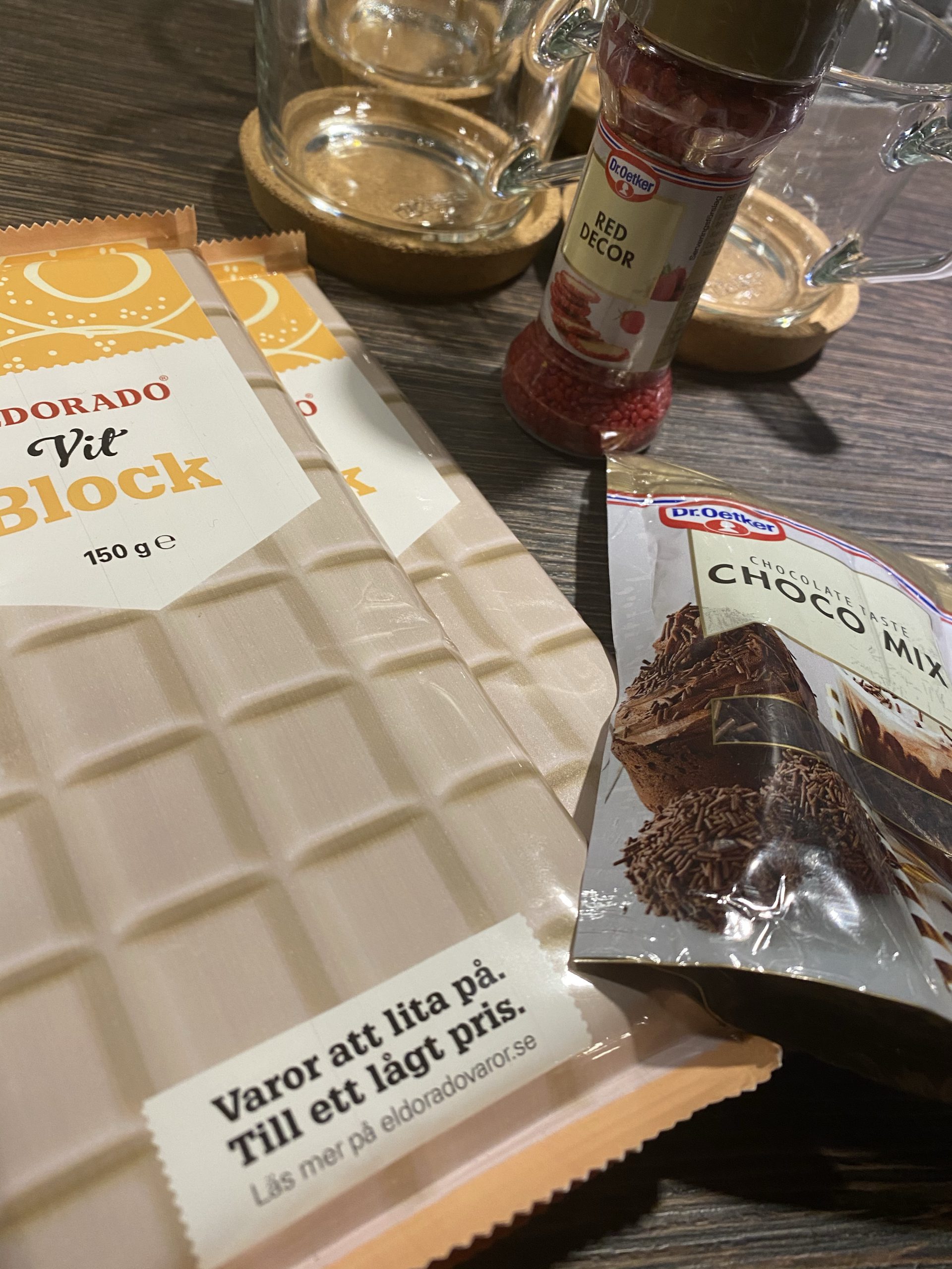 Detta blir några av kvällens ingredienser. Vit blockchoklad, finns HÄR, just nu 4 för 10 kr. Chokladströssel, finns HÄR. Röd strössel HÄR.