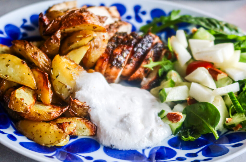 Kycklingen serverades med klyftpotatis (som också tillagades i airfryer), min kokos & citronsås. (<klicka för recept).