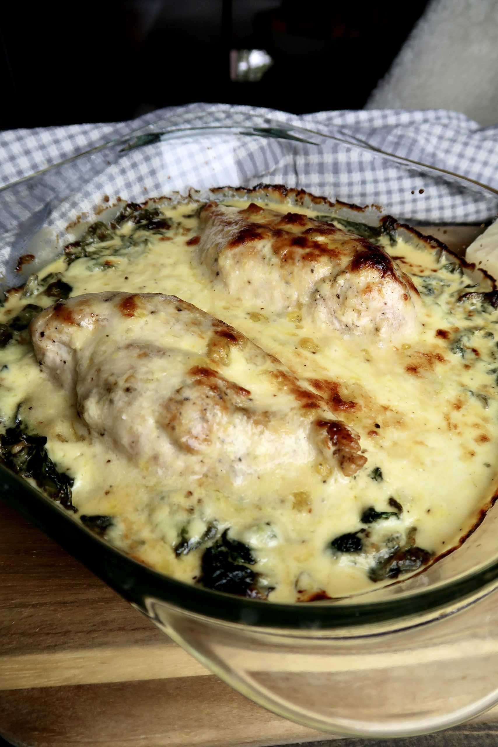 KYCKLING I UGN PÅ SPENATBÄDD MED PARMESAN & VITVINSSÅS, 3-4 portioner