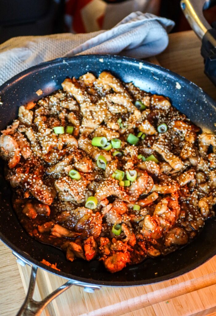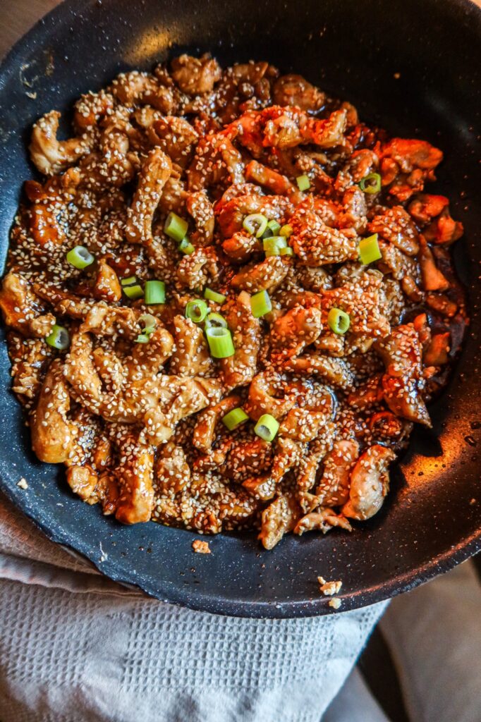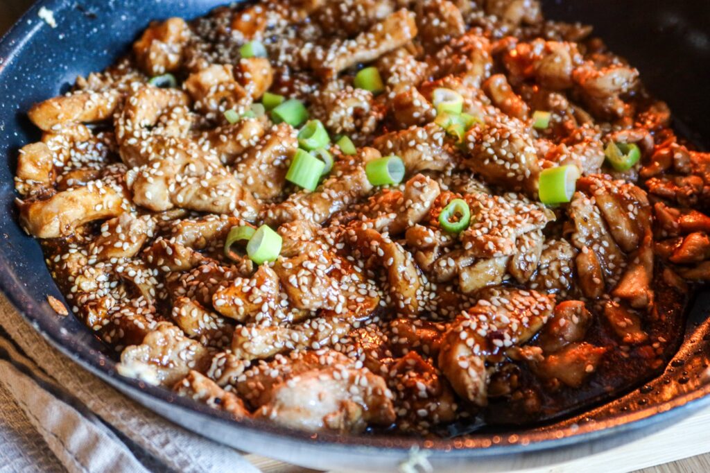 2) Stek strimlad kycklingfile i lite olivolja. Salta & peppra. Häll i teriyakisåsen och sjud runt i ca 1 minut. Strö över sesamfrön.
