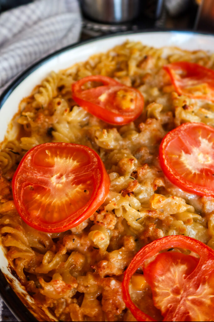 4. Häll kycklingfärssås över pastan, blanda ihop. Toppa med riven västerbottenost och några tomatskivor. In i ugnen på 225 grader tills osten börjar få fin färg.