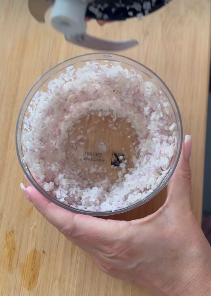 Jag hackar löken väldigt smått då vi har en i familjen som älskar smaken men inte så mycket just bitarna. Det känner ni säkert igen er i ni som har lökvägrare där hemma. Jag brukar använda min lökhackare, den är verkligen grymt bra just för detta. Tipsar om den längre ned.