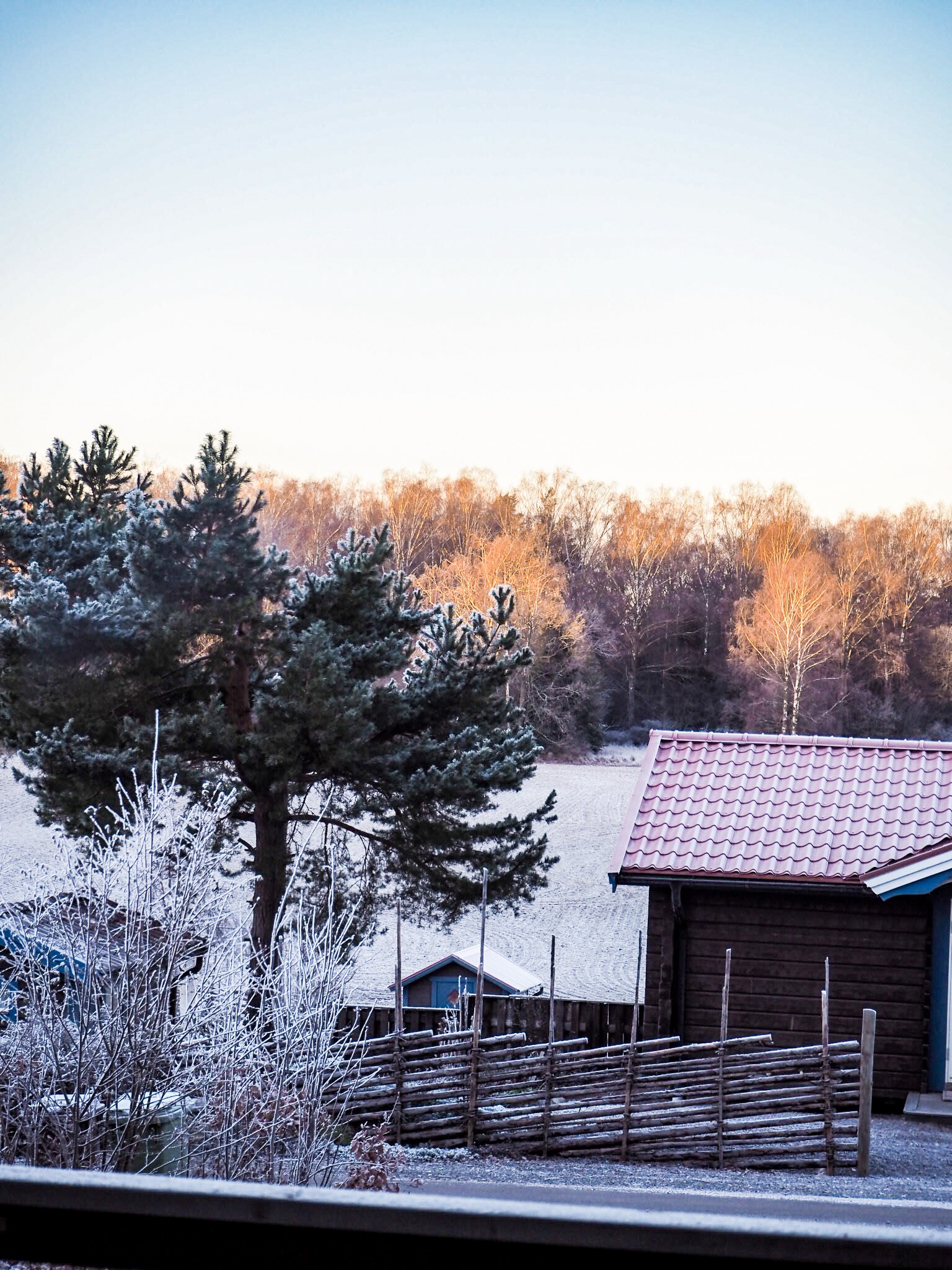 Här är det vinterkänsla när man tittar ut genom dörren. Frost på alla grenar och kvistar, kylan känns faktiskt riktigt bitande fast det bara står typ minus 8. Tror att jag och Tony ska klä på oss ordentligt nu och ge oss ut på en promenad, ska bli uppfriskande! Så jädrans gött när man kliver in sen och få äta gofrulle och dricka varmt te.