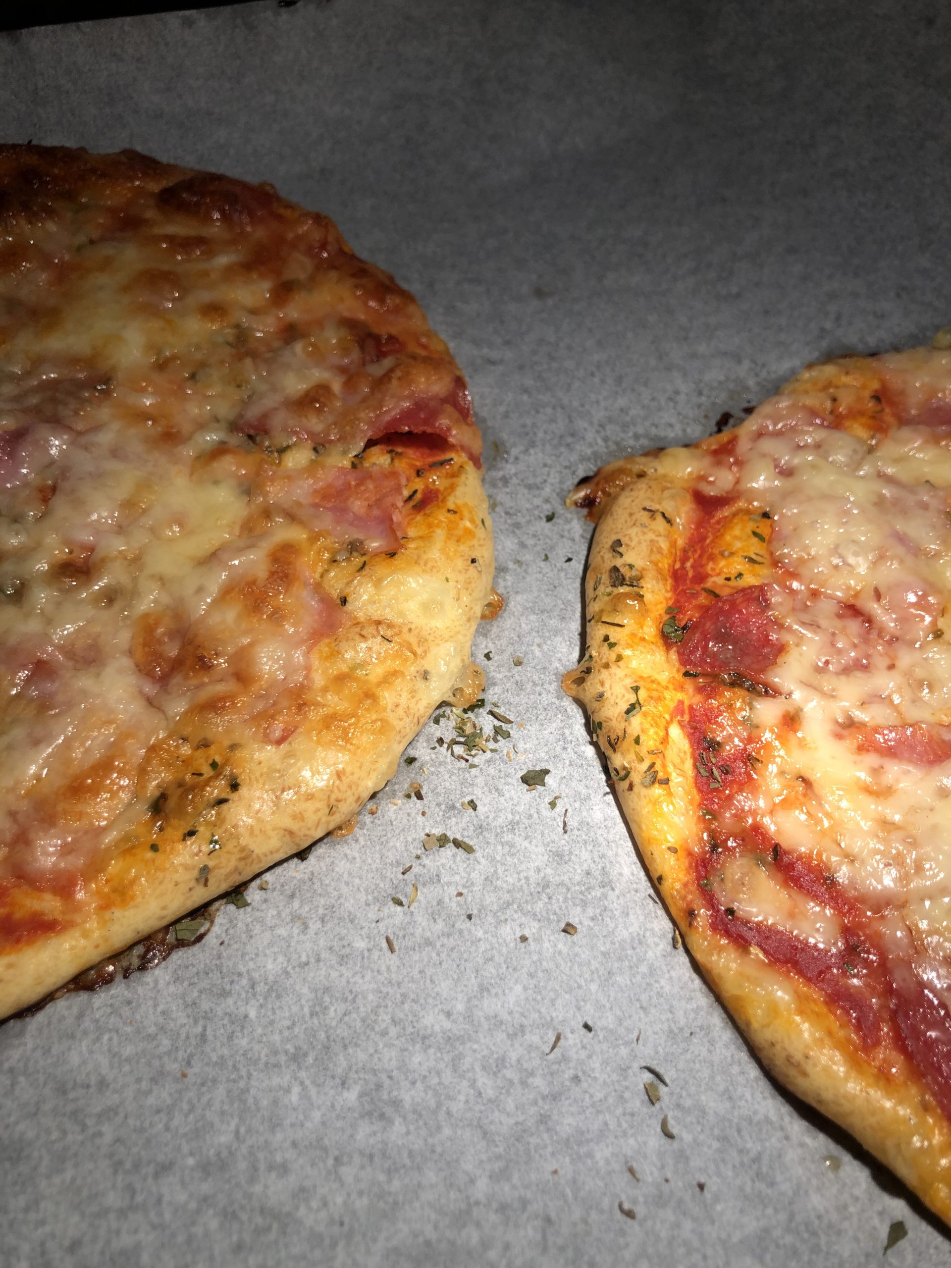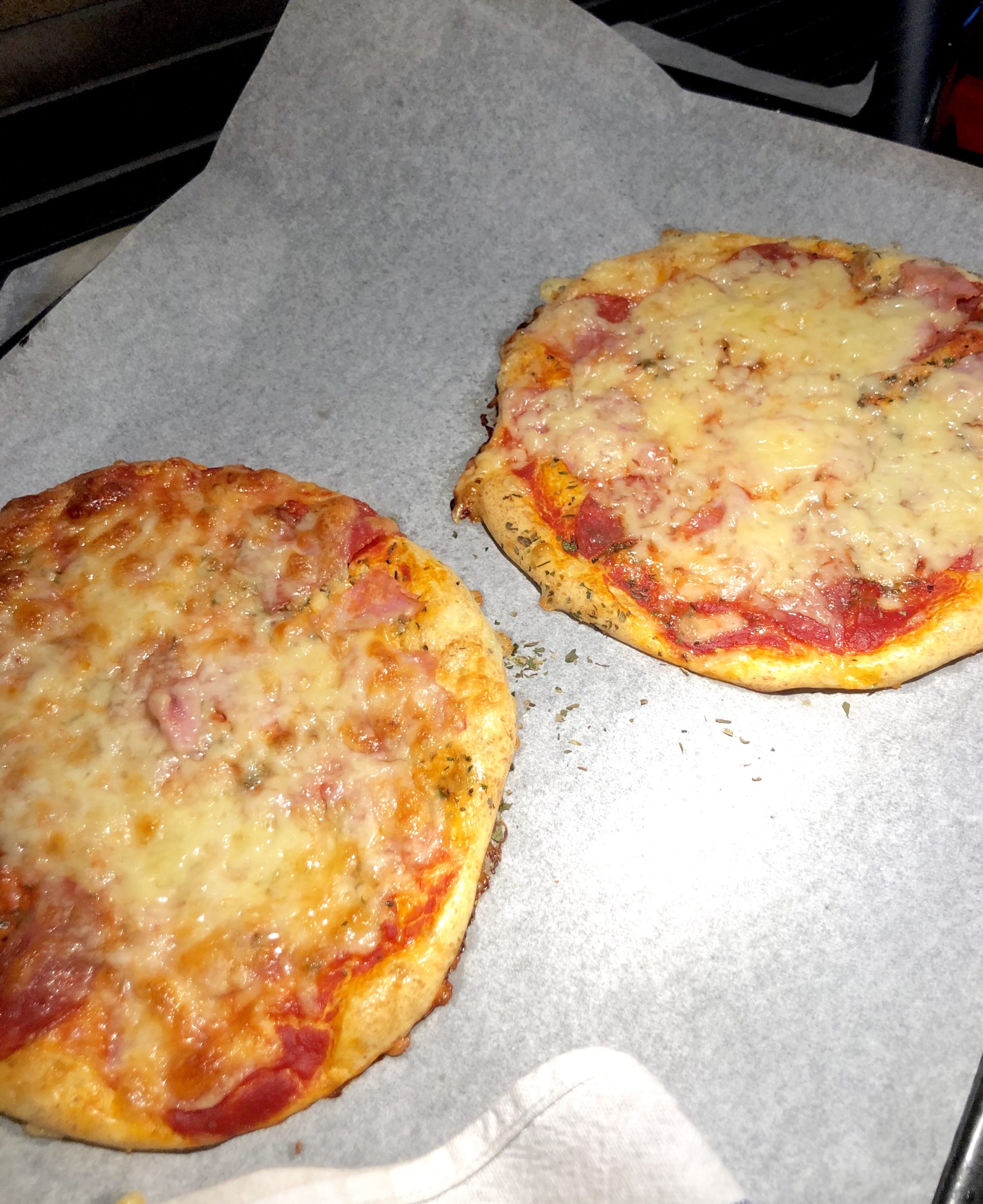 3) Gör 2 pizzabottnar på bakplåtpappersklädd plåt, jag använde en stor sked då degen är nästintill rinnig.