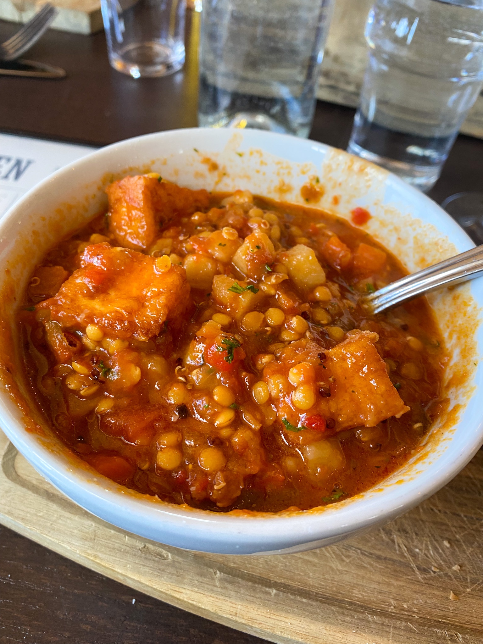 Lunch uppe i toppstugan. Jag åt en vegetarisk ”gulasch” kan man säga. Linser och halloumi innehöll den. Riktigt god och kändes nyttig.