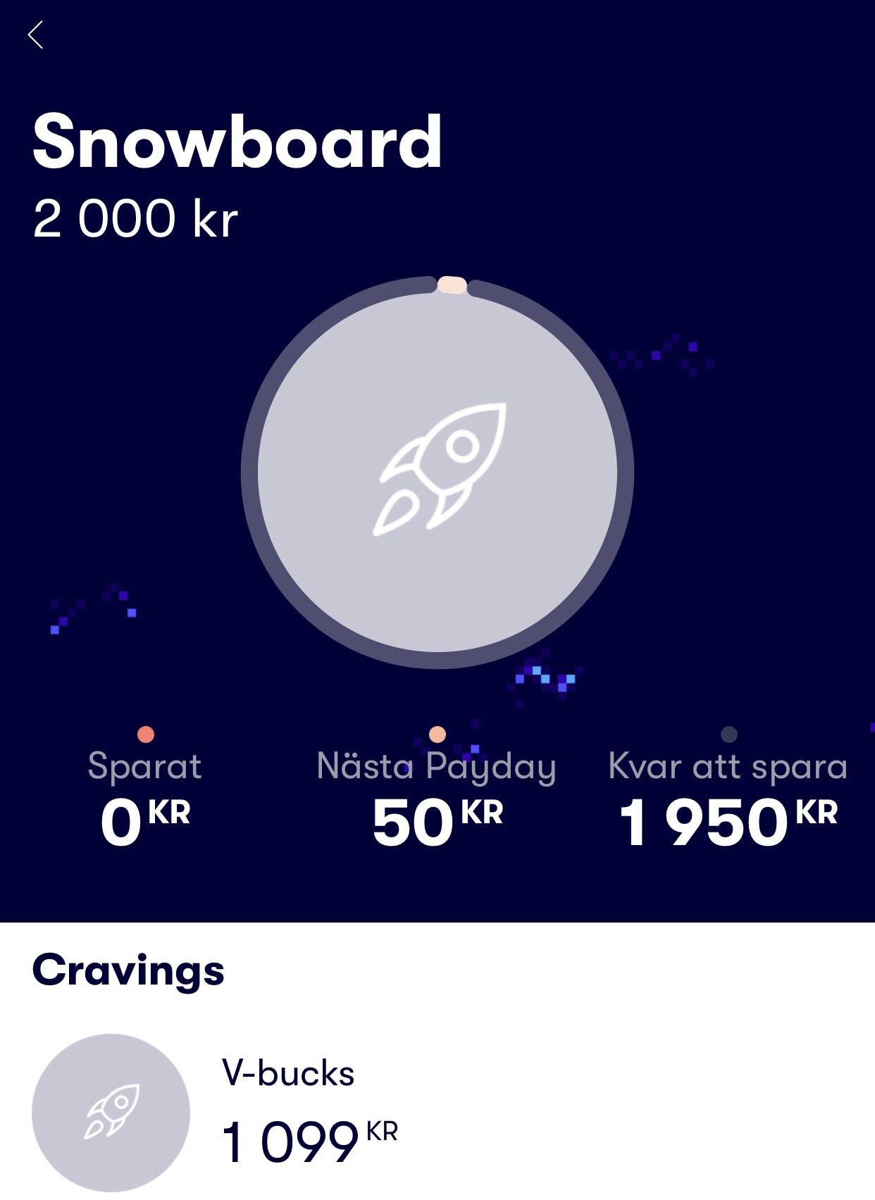 Här har han koll på hur sparandet går. Som du ser så går det sådär just nu. 0 kr sparat då han använt varenda krona. Men nu har han koll. Han vet att det inte blir någon snowboard när man använder pengarna. Inget tjat! Halleluja! Cravings står det och det är grej 2 som han drömmer om. Att få köpa V-bucks för över 1000 spänn till sitt spel.