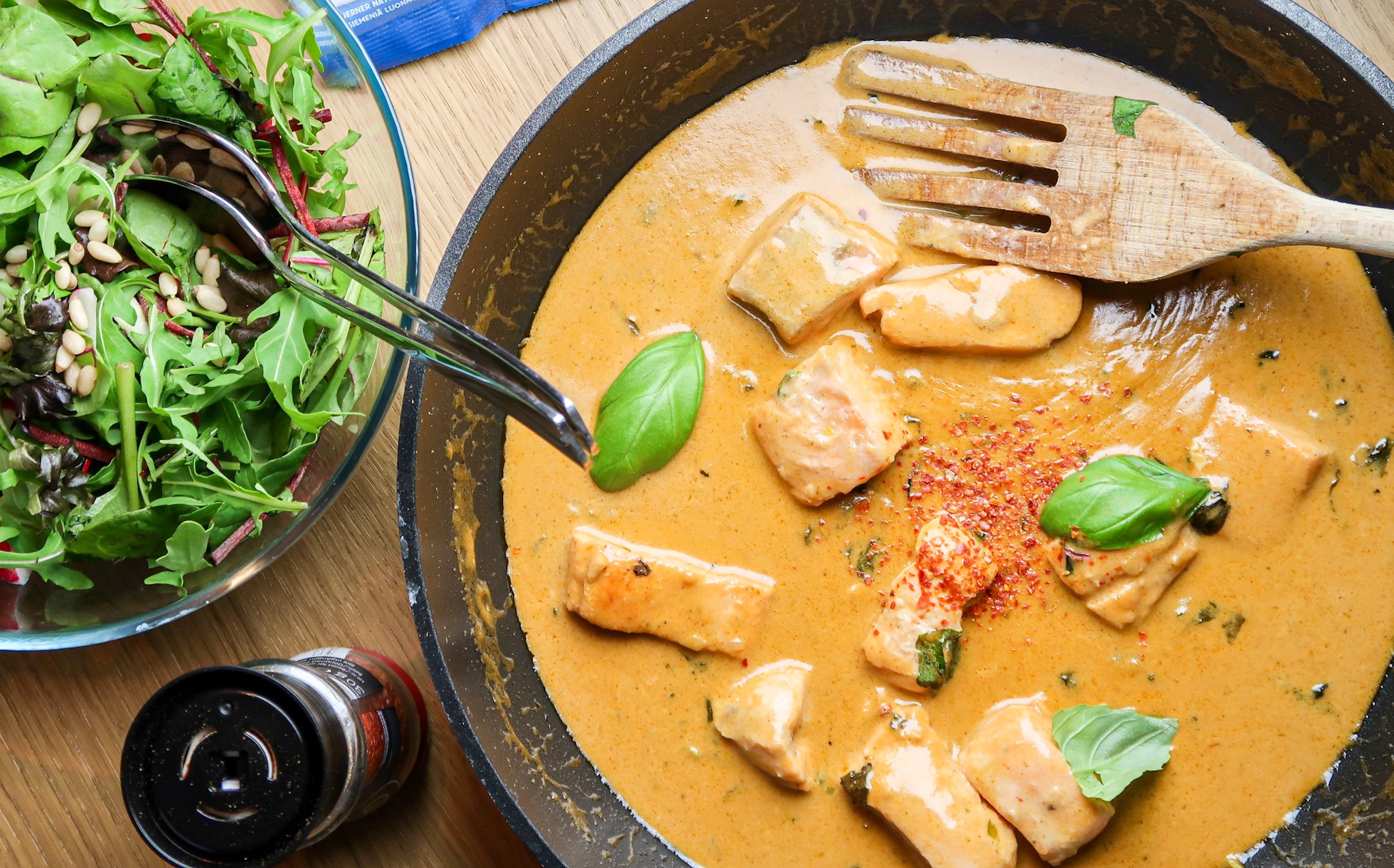 3) Häll på kokosgrädden. Rör ihop ordentligt och låt koka upp. Ha i sweet chilisås och japansk soja. Strimla den färska basilikan och ha i den och rör om. Lägg sedan i laxkuberna och låt sjuda med ca 6-7 minuter.