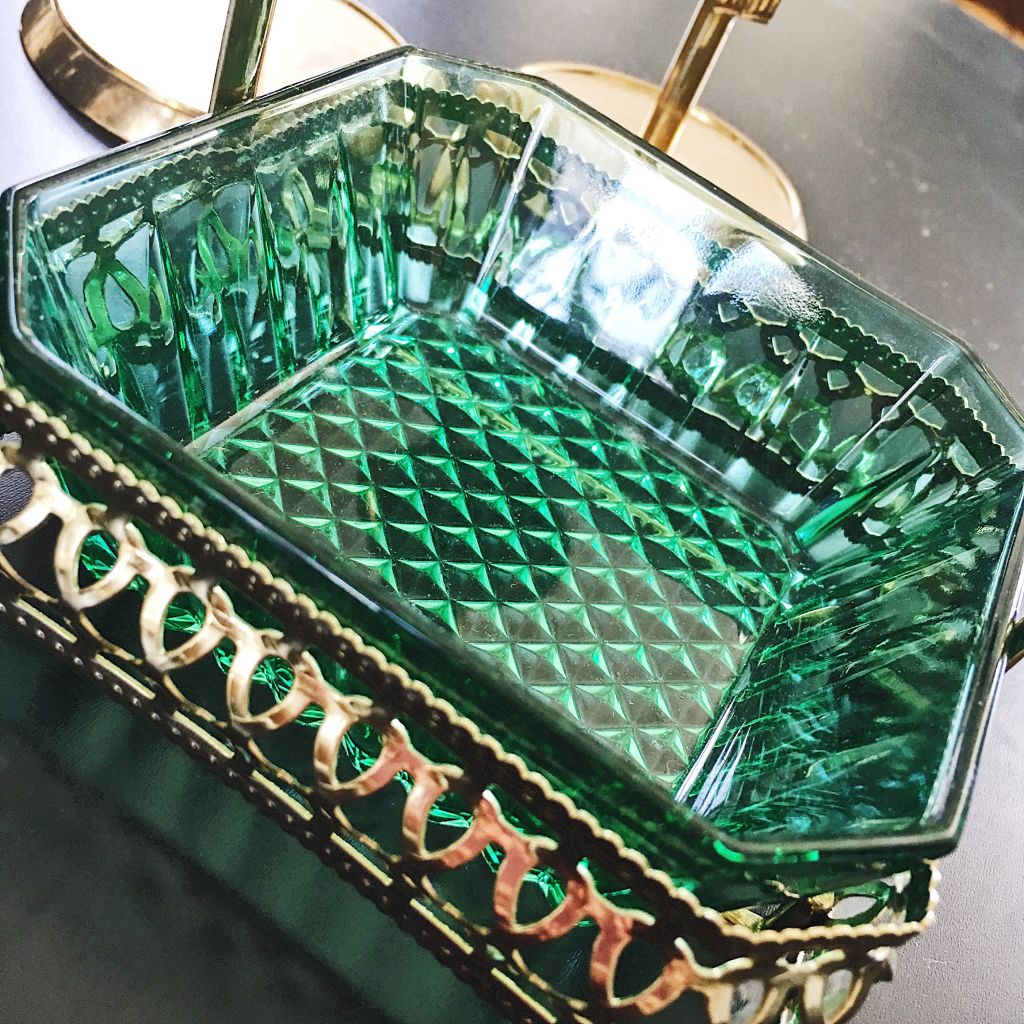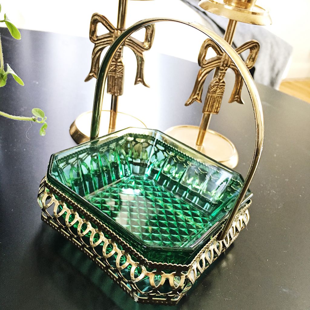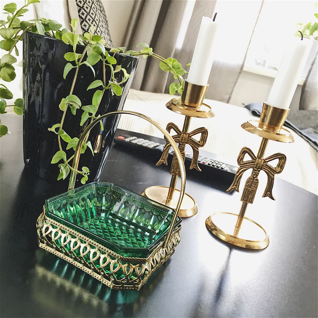 Hittade nämligen denna lilla skål och ljusstakar också. Skålen gick på 40 spänn, ljusstakarna på 20 kr styck. Nu ska jag köpa en grön stor vas att ha färska blommor i på bordet. Jag frångick mässing ett tag men trillar tillbaka med det gröna. Det är så otroligt fint ihop. Ska fylla den lilla skålen men nån god choklad ikväll när det är fredagsmys och allt.