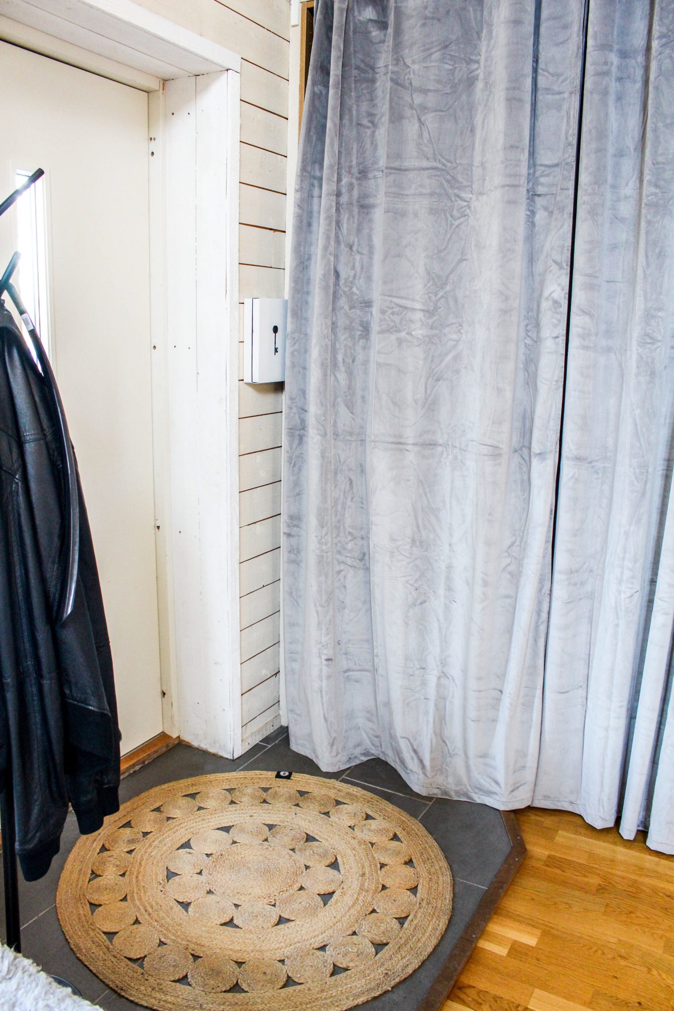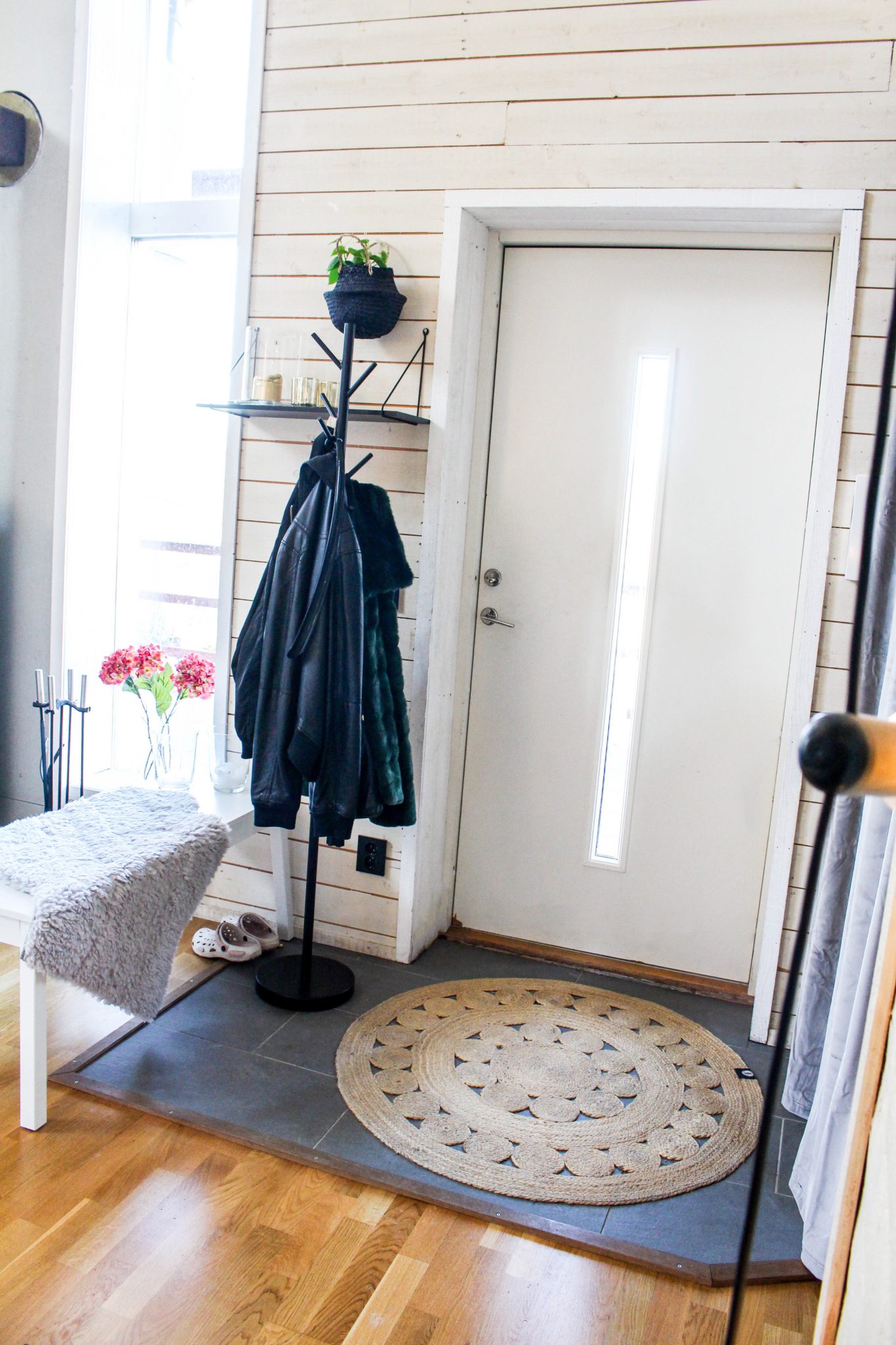 Nu har det gapande hålet fått >>>>runda bastmattan<< som är naturmaterial ger en lugnande skön känsla. Det är det naturmaterial gör, ger en varmare lugn känsla. I den lilla korgen på väggen finns det också naturmaterial, där i ligger en blomma. Hyllan är till för att ha lite mysiga ljus på men också Tonys plånbok som han alltid tar ur byxorna när han kommer hem. Man måste försöka hitta praktiska men fina lösningar. Nyckelskåp har vi så där hänger allas nycklar.