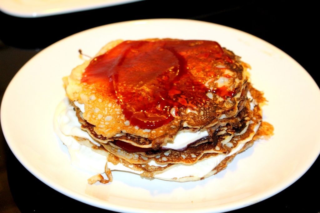 3) Vispa grädde. Varva pannkakor, grädde och jordgubbssylt tills du har en härlig pannkakstårta.