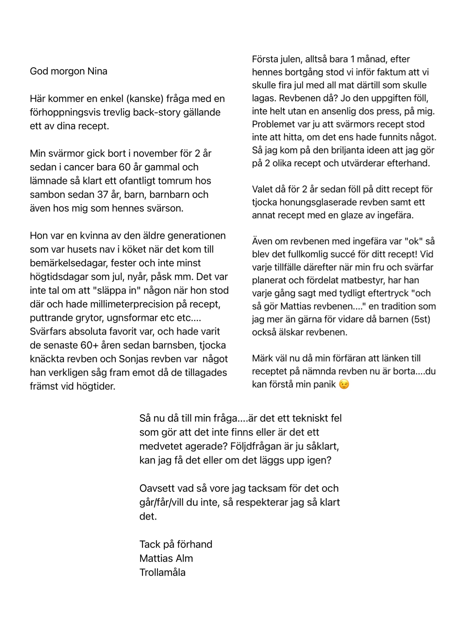Samtidigt som mitt hjärta fylldes av glädje så högg det i det. Anledningen till att receptet var försvunnet för Mattias var för att jag skulle ompublicera det till jul. Det gick helt enkelt under radarn och låg i min privata korg här på bloggen. Efter Mattias brev fick jag bråttom att ompublicera receptet, men först så skickade jag det via mejl till honom. Receptet skulle avnjutas redan till helgen berättade han. Det slog mig då att ni kanske är fler där ute som saknar det, så här har ni det i sin helhet. Dessa revbensspjäll är precis som Mattias svärfar tycker succé, och förmodligen rätt lika Sonjas revbensspjäll. Riktigt saftiga, söta och fantastiskt goda revbensspjäll. Vi blev bjudna på dessa revbensspjäll och jag var bara tvungen att fråga efter receptet. Mitt recept här nedan är inspirerat av Leilas recept på revbensspjäll, men jag har ändrat det efter smak och tycke. Dessa kommer göra succe på julbordet, det kan jag lova! Precis som Mattias svärfar skriver, det är dessa som ska stå på julbordet, inga andra. Så fint! 🥹❤️ Det mest fantastiska är ju att revbensspjäll kan man äta när man vill, kanske redan i helgen?