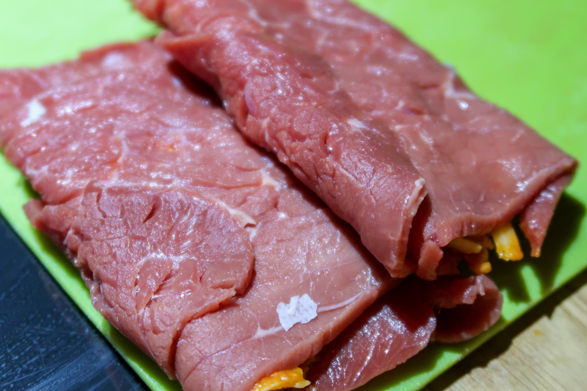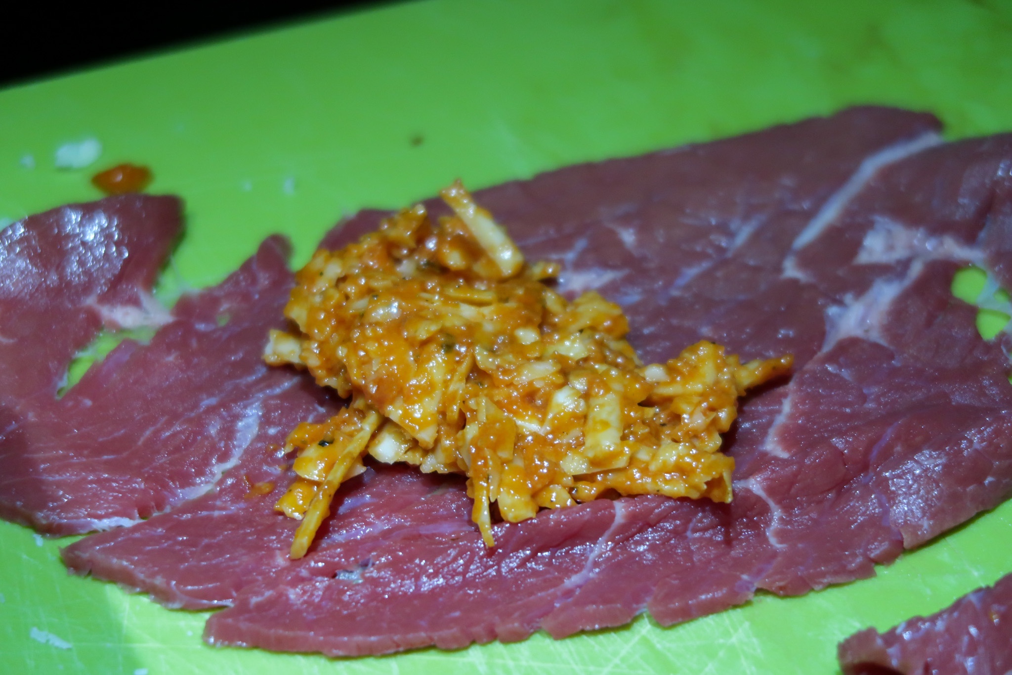 1) Blanda riven ost och pestoi en bunke. Salta och peppra. Bred ut en klick på varje lövbiff.