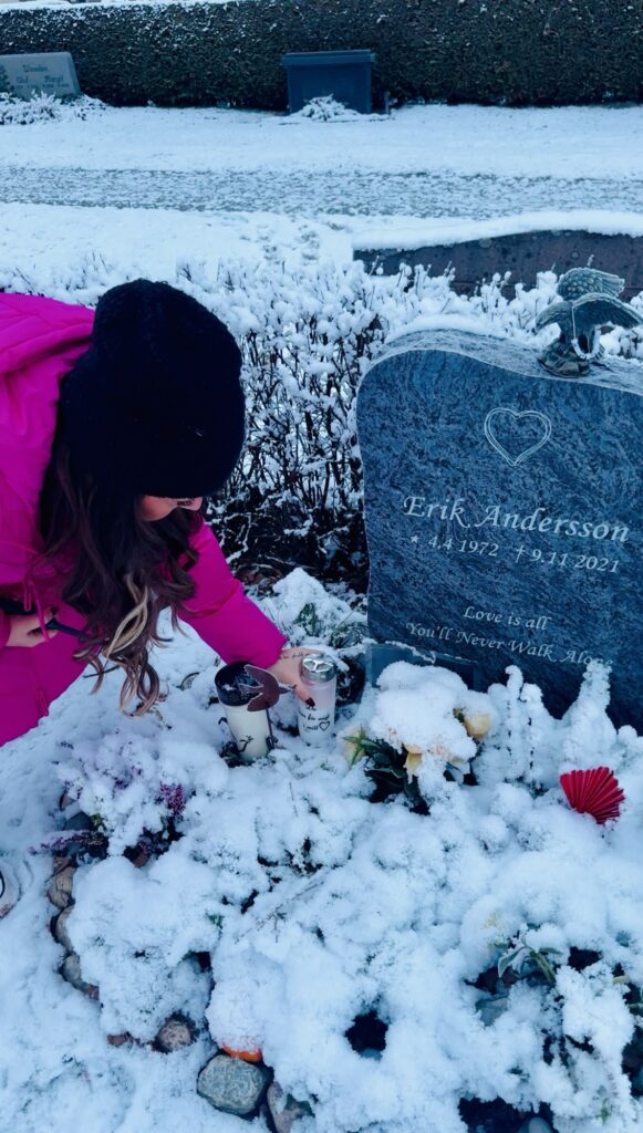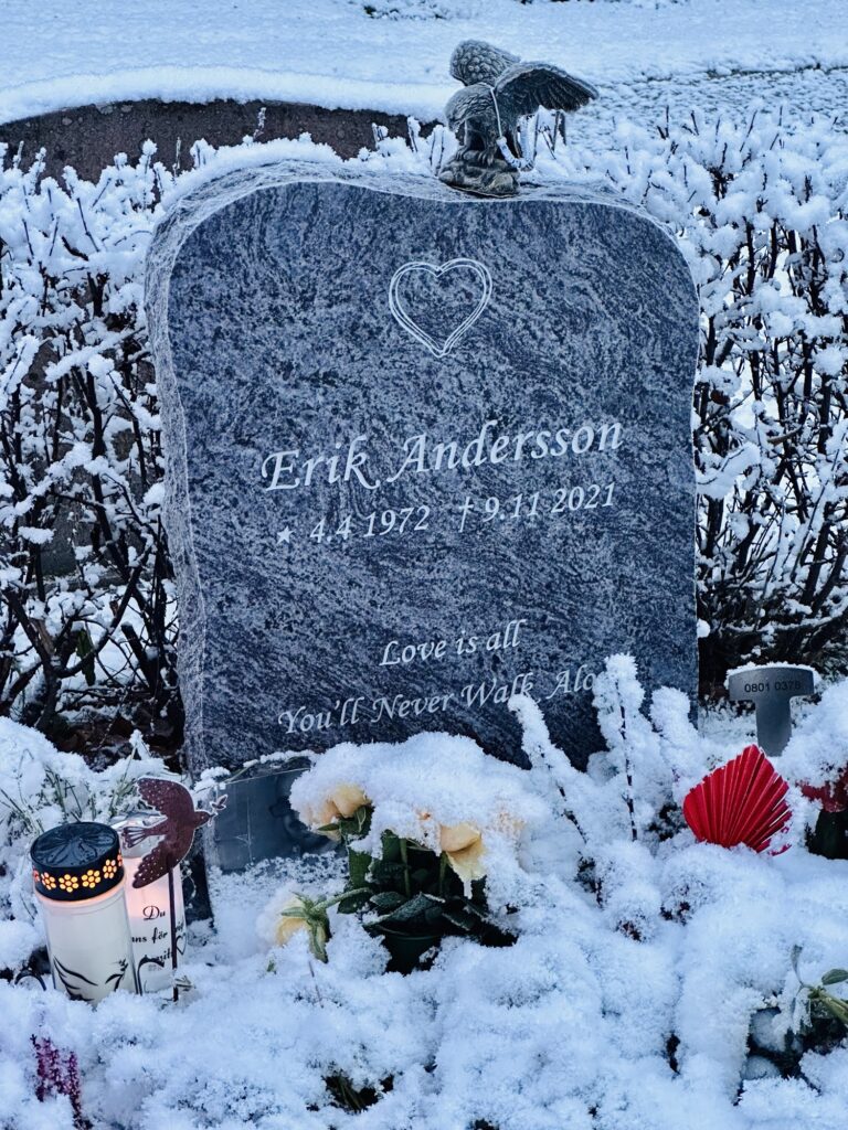 Att hälsa på nära och kära på kyrkogården eller minnesplatsen hör till julen för mig. Jag var och hälsade på min vän Erik häromdagen. Vi lämnade ett ljus, vi tände upp de som slocknat och önskade Erik en god jul i himlen. För er som inte vet så är Erik en vän till mig som drabbades av cancer. När han fått beskedet att inget fanns att göra samlade jag och min vän Aslan ihop nästan en halv miljon till han som han kunde använda för alternativ behandling i Tyskland. Erik fick 8 månader extra i livet, men till slut blev en infektion för allvarlig och kroppen orkade inte längre. Jag var och tog farväl av honom på palliativa avdelningen, jag hann inte innan han dog då jag var hos Thedde i Schweiz, men jag fick säga hejdå ändå. Han låg där så fridfullt med Liverpool tröjan på magen. Han hade gått bort till tonerna av Liverpools officiella låt ”You’ll never walk alone”. Det var en så fin och rörande stund där inne hos honom, vi var så många som satt där, precis så som det var i verkligen livet…. Så många som tyckte om honom.