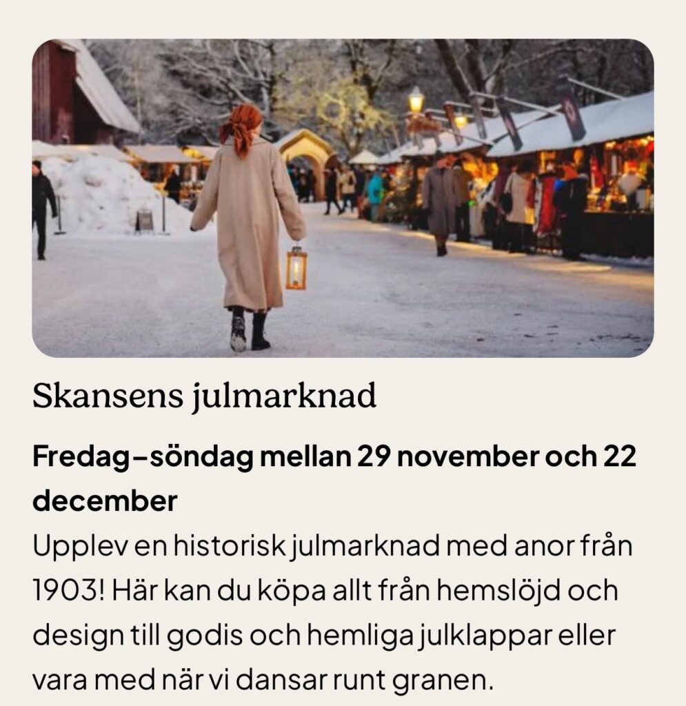 I helgen hoppas jag att vi får tid att besöka Skansens julmarknad. Tänk att den funnits sedan 1903. Va? Det är ju inte klokt. I helgen kan man dansa runt granen, det kommer finnas en kringvandrande kör som sjunger julsånger, du kan köpa hemliga julpaket, man kan uppleva julen från förr i flera av de små husen på Skansen, man kan äta julbord och mycket mera.