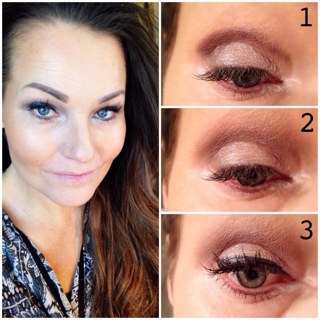 1) Börja med att ha nr: 1 på själva locket. Den är det rätt mycket pärlemor i så jag försöker hålla den mest på locket. Detta pga att vi som har linjer på ögonlocken framhäver dessa med pärlemor. Pärlemorskuggor reflekterar på ett helt annat sätt vilket gör att linjer t ex då istället framhävs. Vill man inte det så kan man ju försöka undvika det. Ha sedan på nr: 2 som på bilden. I själva globlinjen och lite ovanför. Behövs inte lägga på noga alls utan den ska sedan tonas ut med en pensel. Jag använder pensel här.