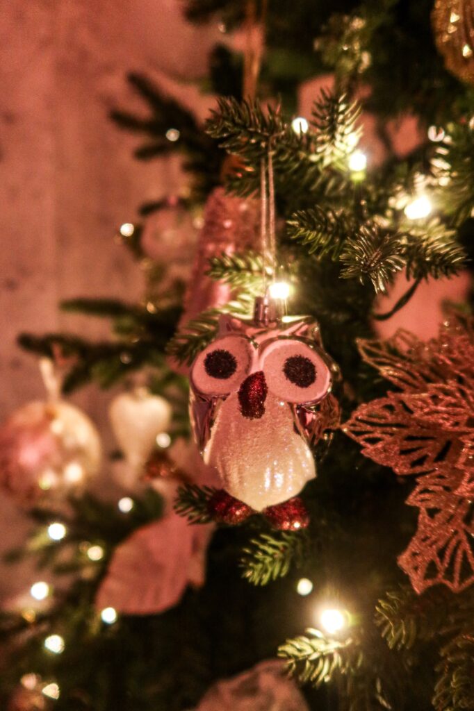Vår julgran! Vet ni hur mycket jag älskar den. Nej men varje dag står jag och beundrar den. Den är precis så som jag vill ha den nu. Vi har plastgran men en sån som påminner mycket om en äkta. Det är bara längst in som den har de där lite plastiga fladdriga sakerna till granbarr, annars så ser den helt äkta ut. Vi har haft den i flera år, en sån med belysning som följer med, vårt nästa köp tror jag. Granen tror jag vi köpte på Rusta, det mesta förutom lite rosetter, en och annan kula och Uggla (fått av en av barnen) så är julpyntet från den härifrån (<klicka).