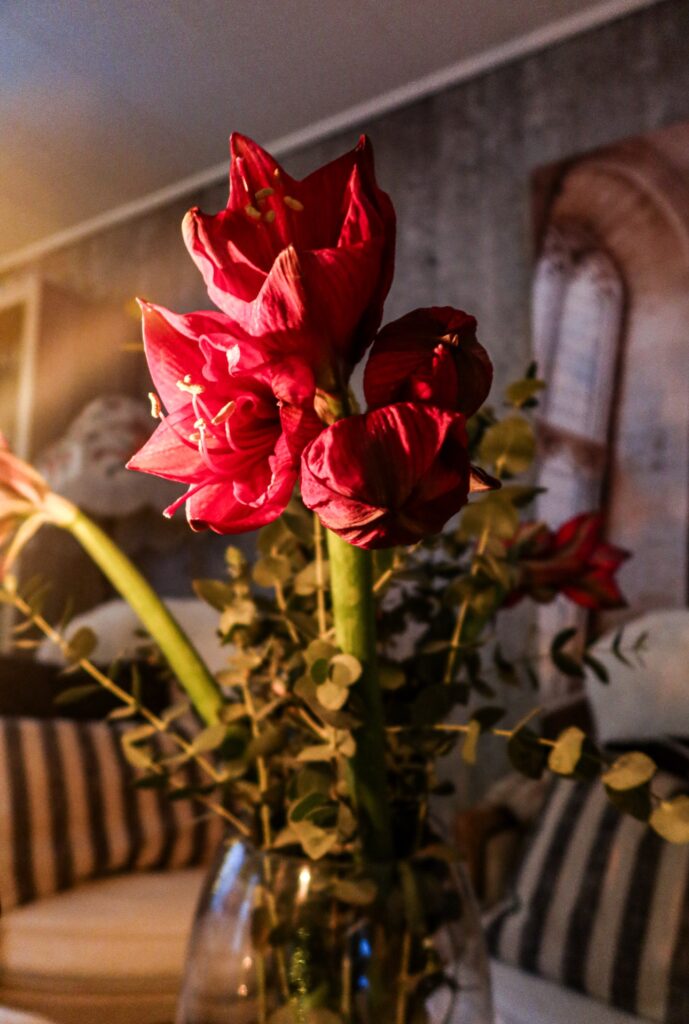 Ja jag har haft ett gäng amaryllisar redan! Julens absolut vackraste blomma om du frågar mig. Sedan handlar det om timing. När ska man köpa dom för att de ska vara som allra vackrast på julafton? Jo men jag har testat. Jag köper dem som är helt outslagna om du förstår vad jag menar? Knipsar av längst ned, sedan in i vatten så tar det ca 2-3 dagar för dem att slå ut helt. Så det är jag som kvistar till Blomsterlandet (69 kr/st) och handlar snittade amaryllisar på lördag.