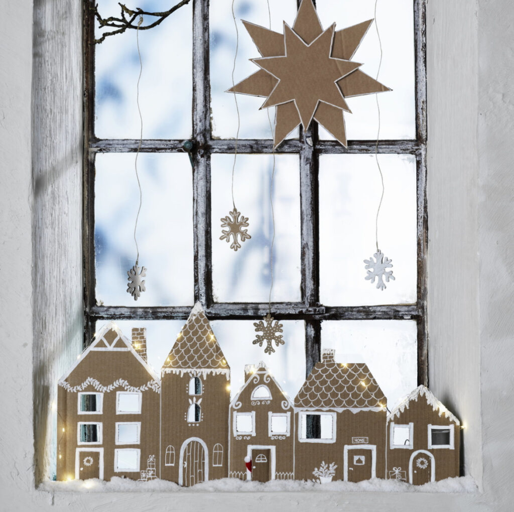 Kolla vad jag hittade på Panduros sida – här visar de hur du lätt kan sätta ihop ett pepparkakshus av vanlig kartong. Sånt har i varje fall vi hemma så det räcker och blir över. Bara en vit penna så kan man ju göra så mycket fint. Jag blev sååå inspirerad av detta.