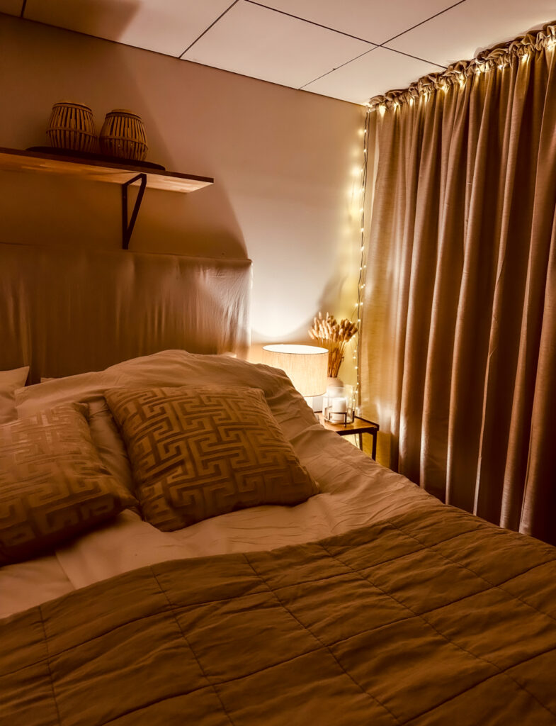 I sovrummet hade jag förra året hängt upp en ljusslinga som jag heeeeelt glömt bort. Den har varit urdragen så jag har liksom inte reflekterat över att det sitter en där. Men så igår när jag höll på och fixade i sovrummet så hittade jag ju den, satte i den och voilà så hade sovrummet också fått sig ett litet extra julpynt. Blev sååå mysigt ju!