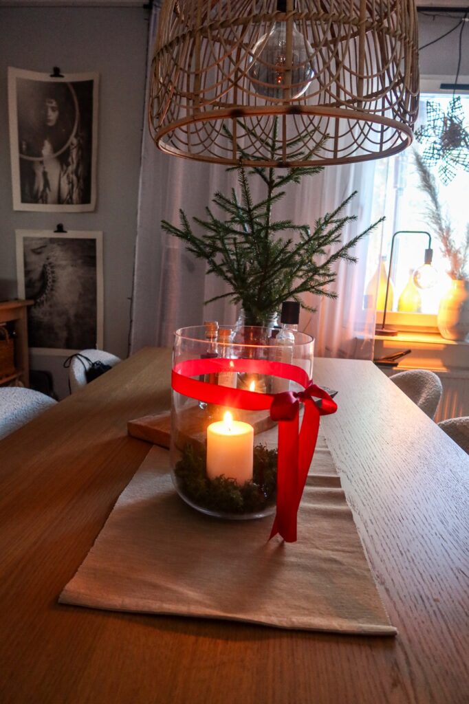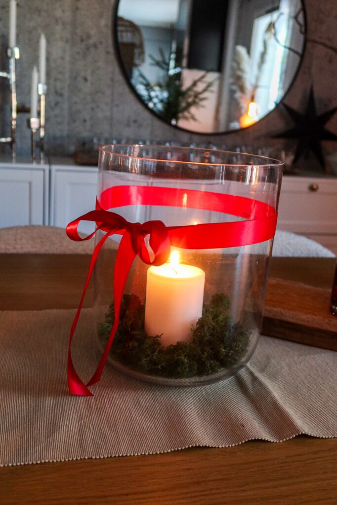 Med en maffig cylindervas, den här är rejäl och stor. Tung också med tjockt glas, älskar den. Med cylindervasen, mossa, ljus och rött band kommer man långt. En av de finaste julpynten vi har hemma skulle jag säga. Älskar att tända ljuset i denna på morgonen.