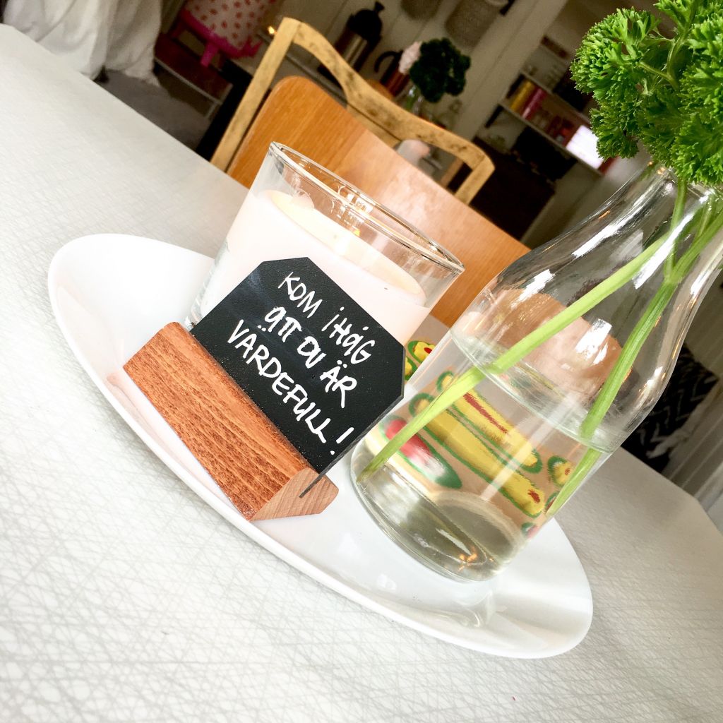 Har satt ut små söta skyltar på borden. Sen har vi persilja blandat med pelargon i de små vaserna. Hur sött? Det var Tony som kom ställde dom där i, min lilla Ernst!