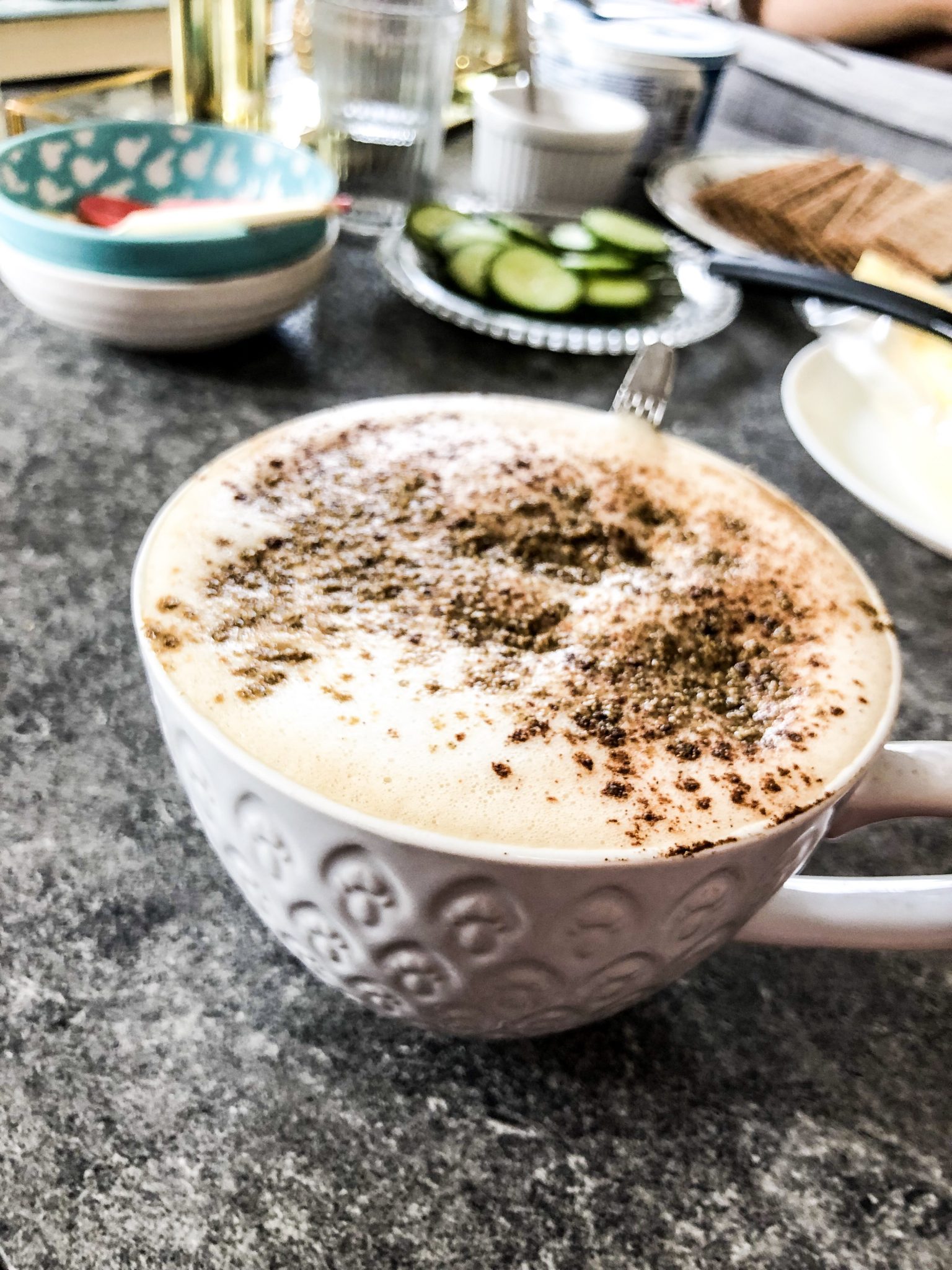 Efter träning var det härligt att komma hem och få äta en redig frukost. Jag vräker på kardemumma och kanel på min skummade mjölk på kaffet. Det är sååååå gott!