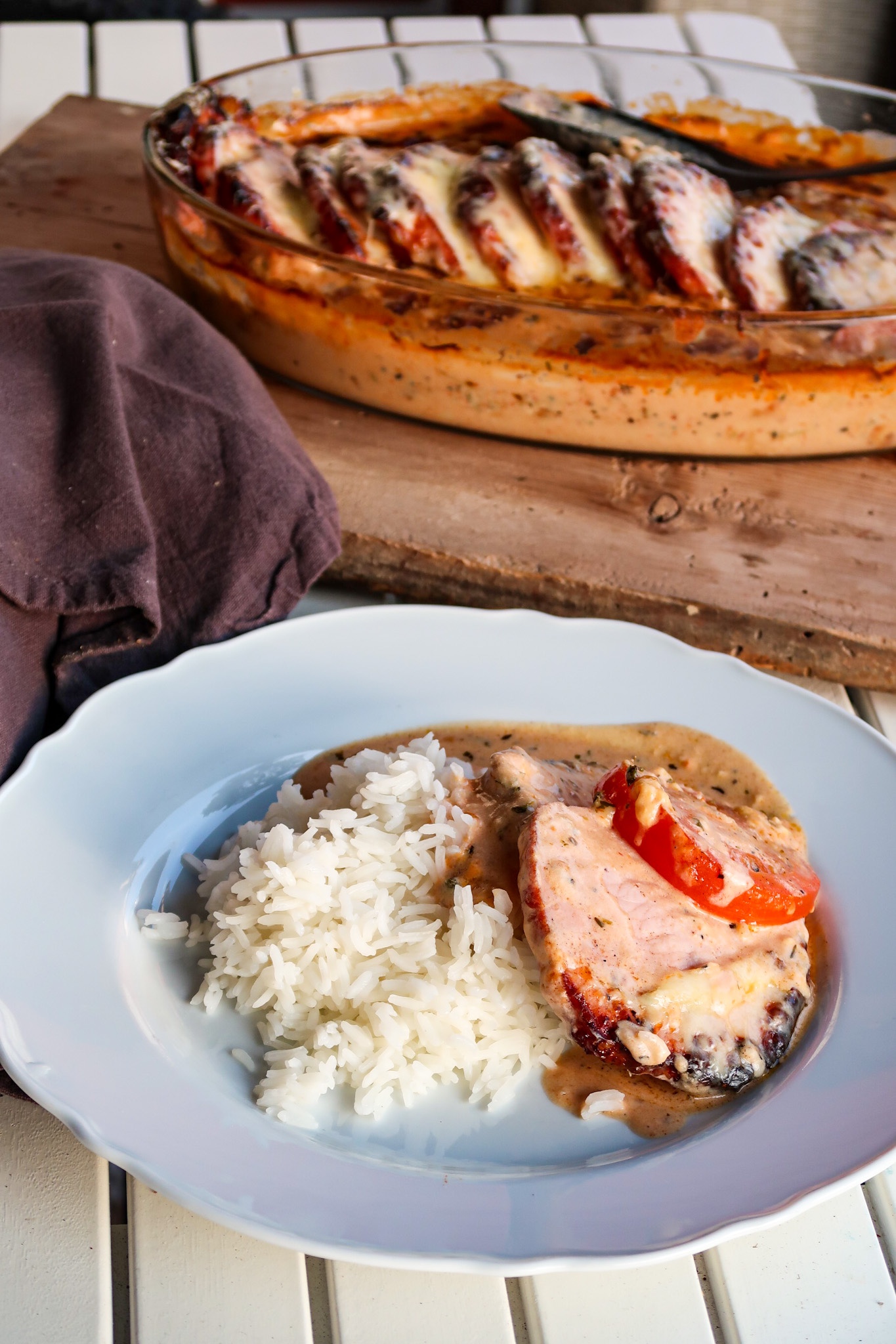 Då försteker du fläskfilén i skivor först (ca 2,5 cm tjocka), samma temperatur och samma tid i ugnen.