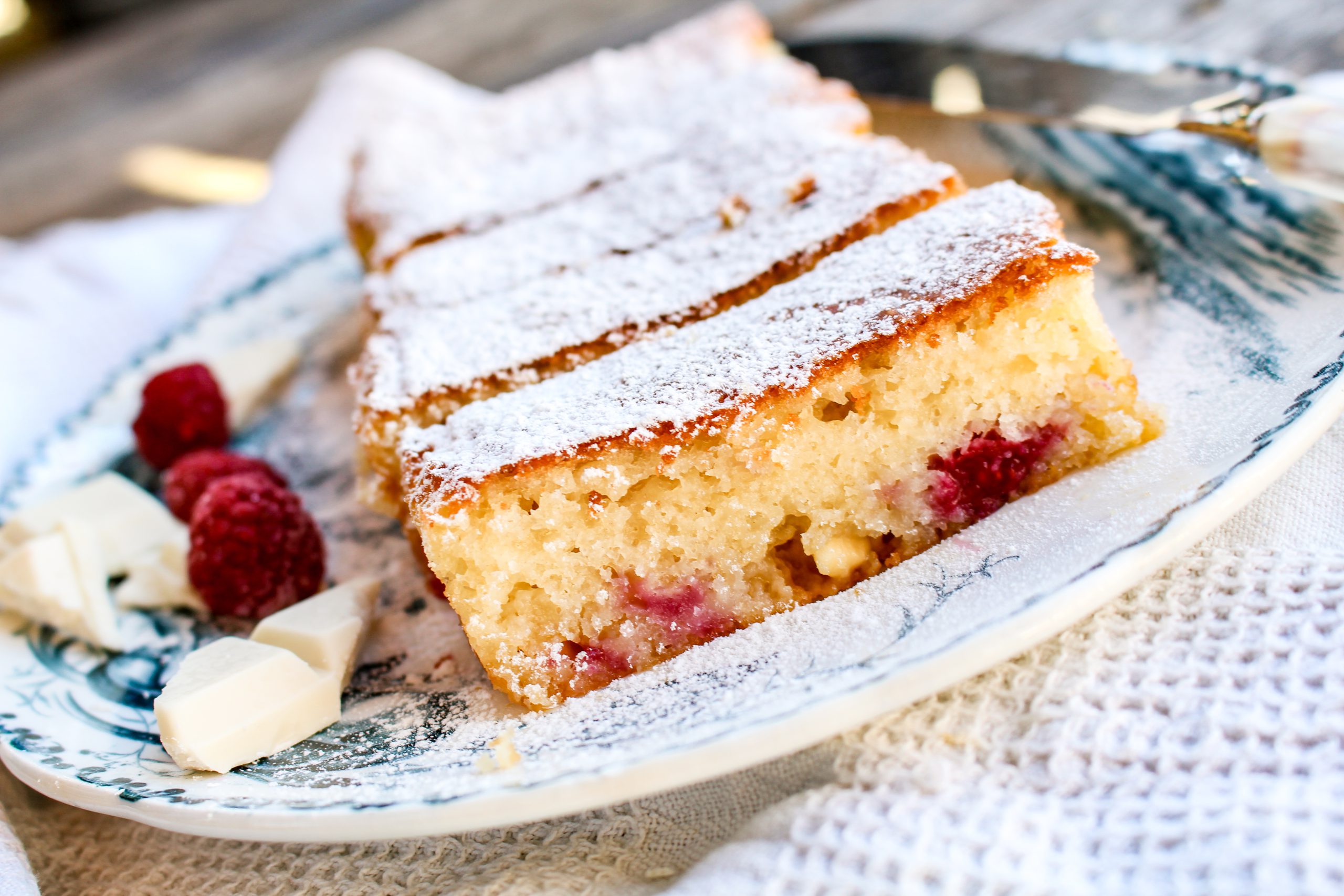 En snabb hallon och vit chokladkaka som går riktigt snabbt att laga.
