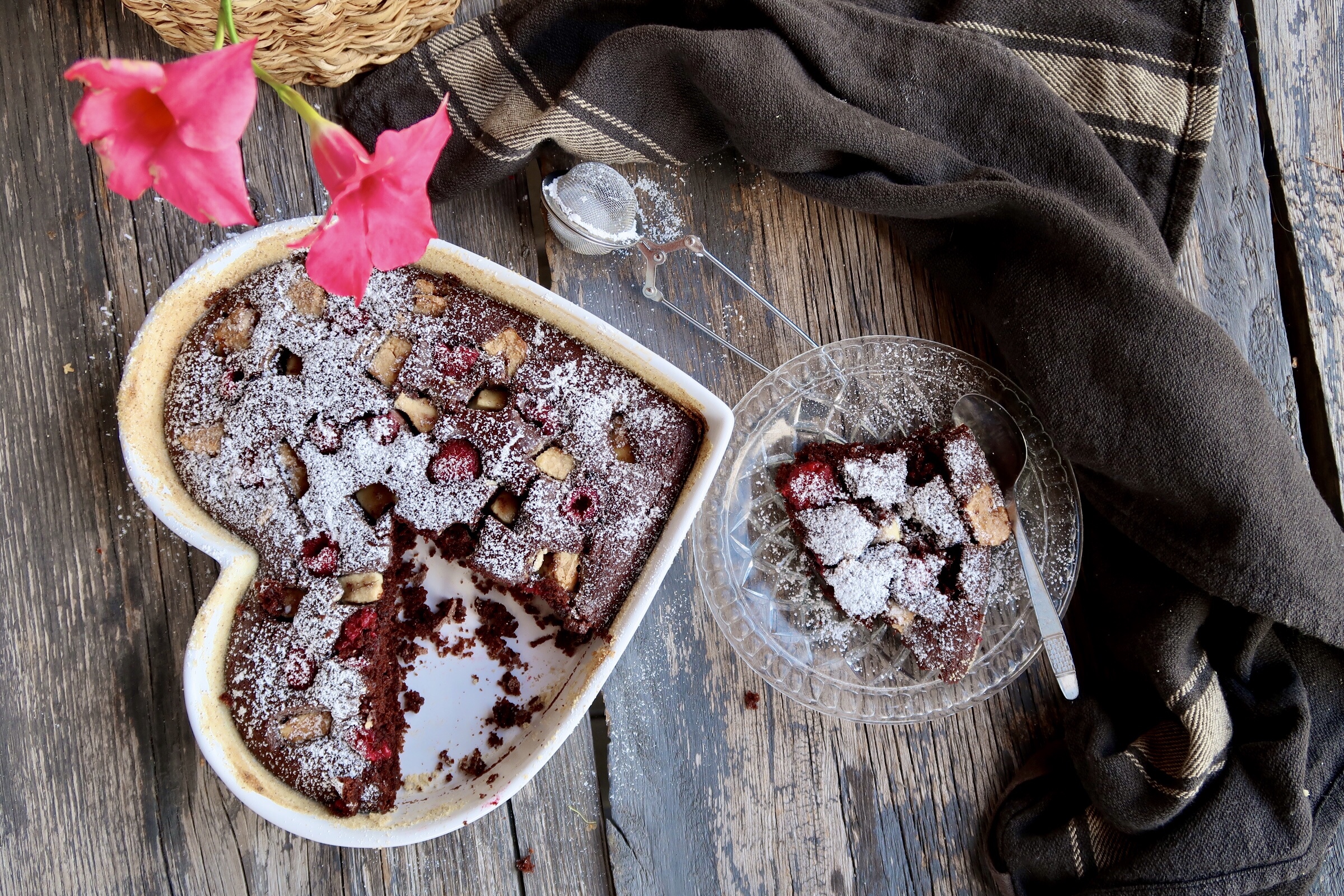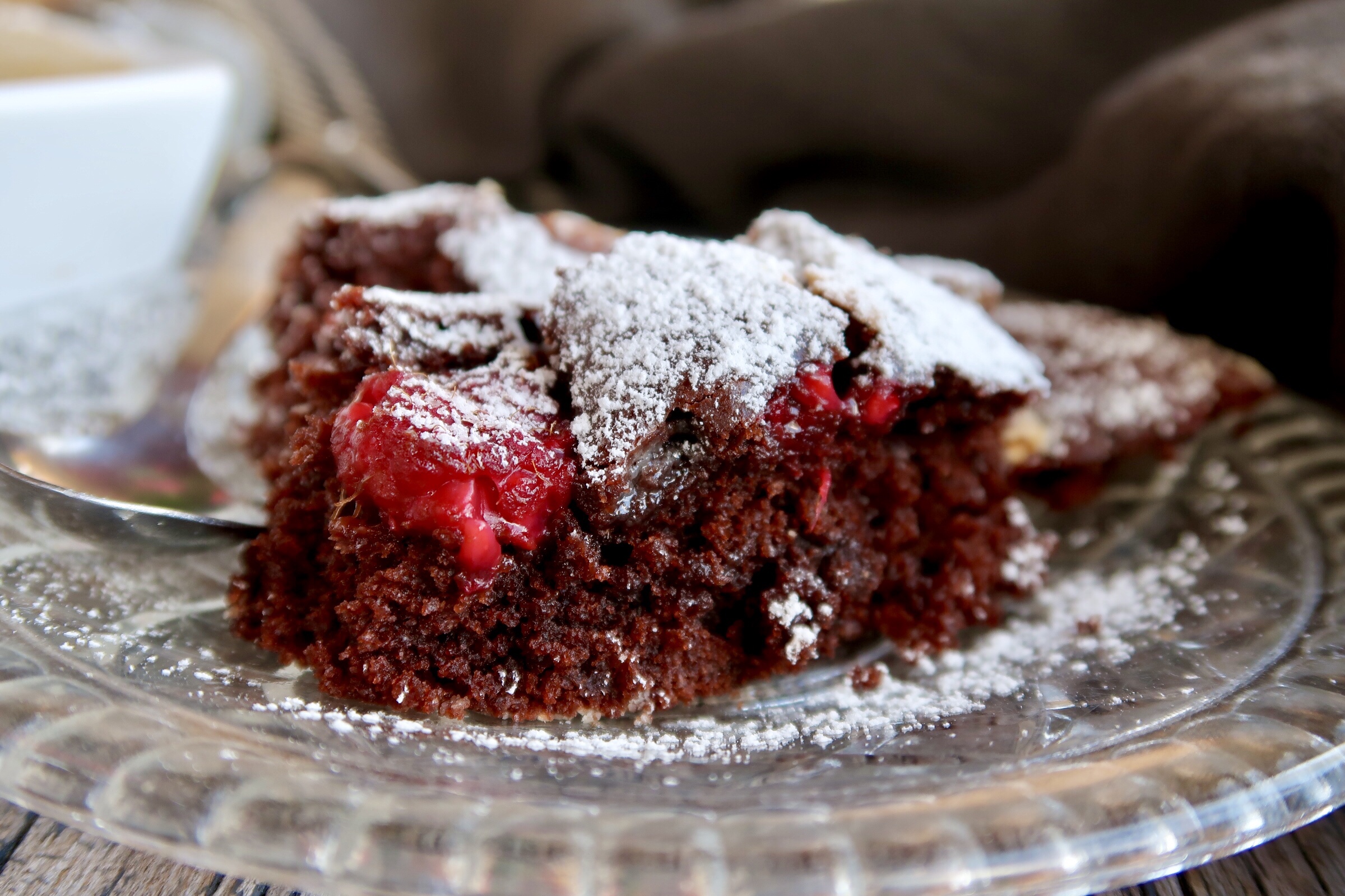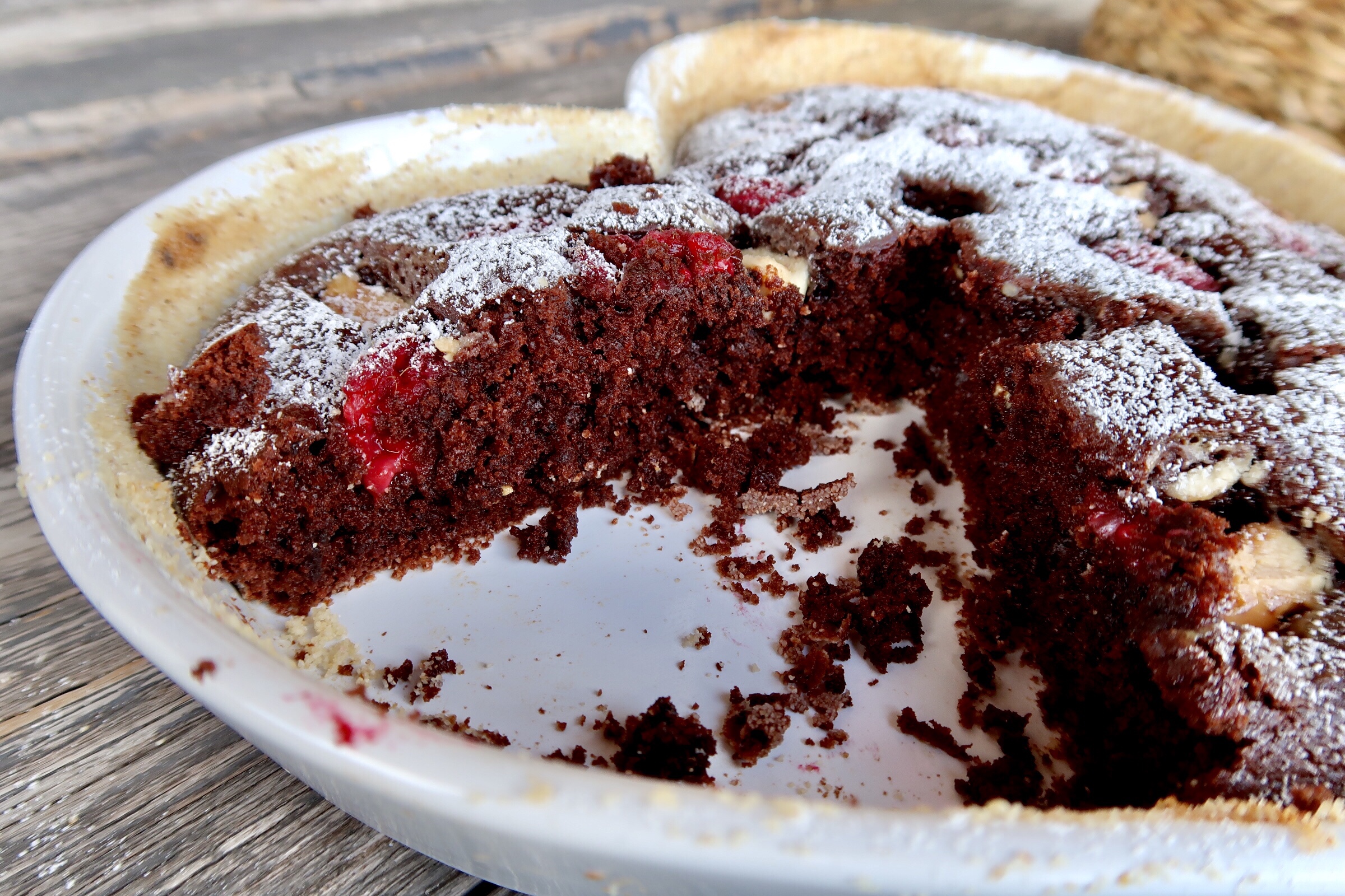 3) Smörj och bröa en form. Häll i smeten. Ha på färska hallon och tryck i bitar av vit choklad. Grädda långt ned i ugnen, ca 15-20 min. Kakan får gärna vara lite kladdig i mitten när du tar ut den.